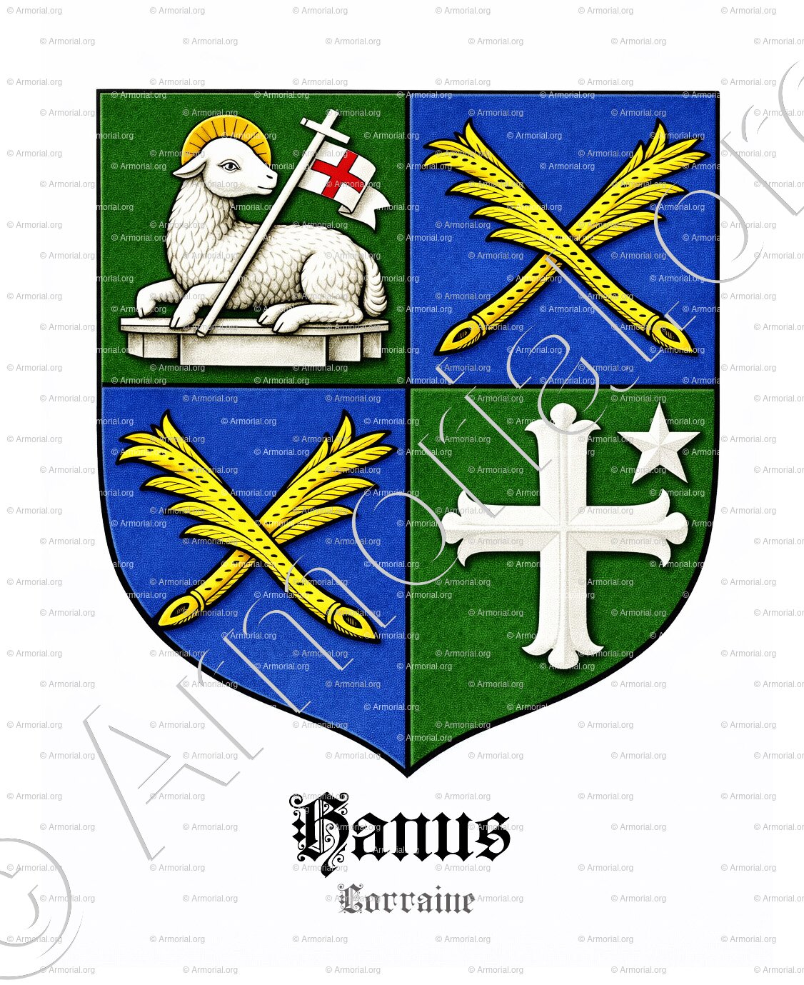 " Écartelé: au 1, de sinople à l'Agnus Dei d'argent; aux 2 et 3, d'azur à deux palmes de laurier d'or posées en sautoir; au 4, de sinople à la croix alaisée d'argent, accompagné d'une étoile du même au canton senestre. "