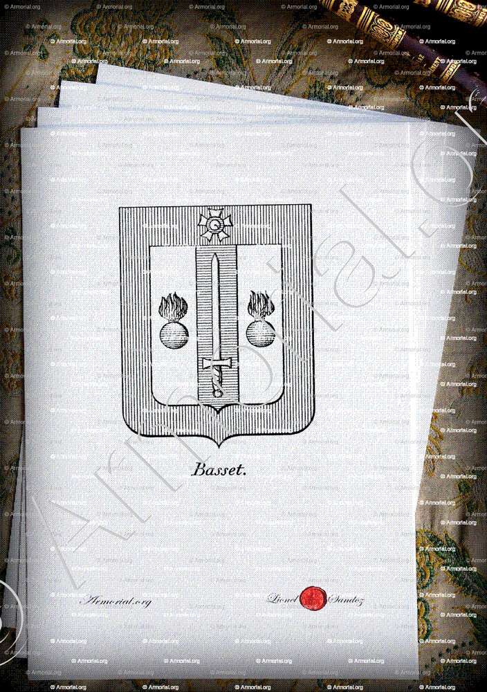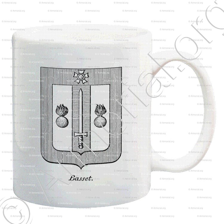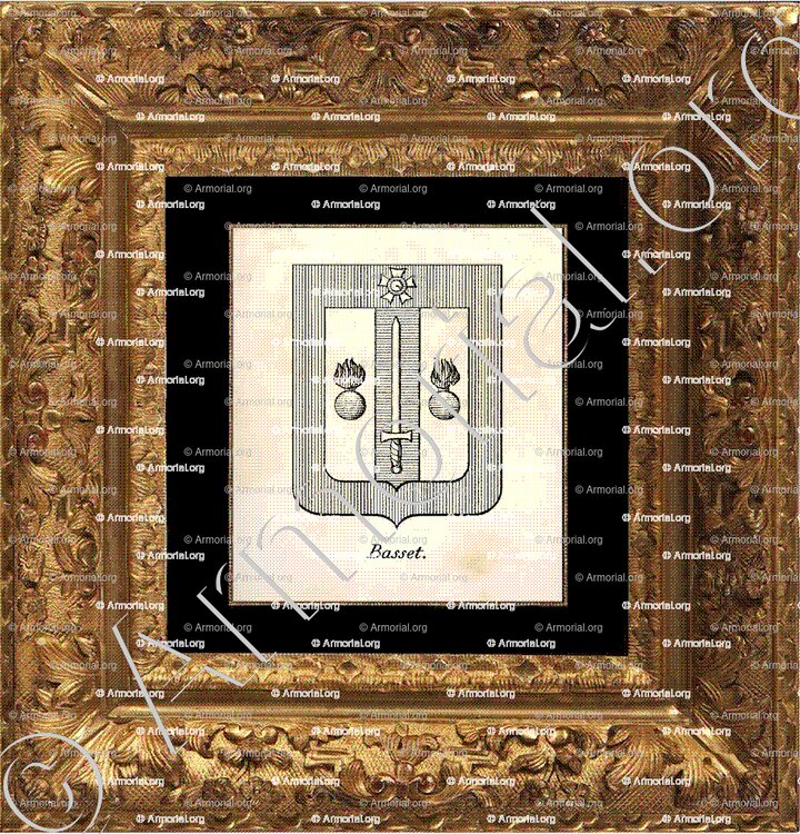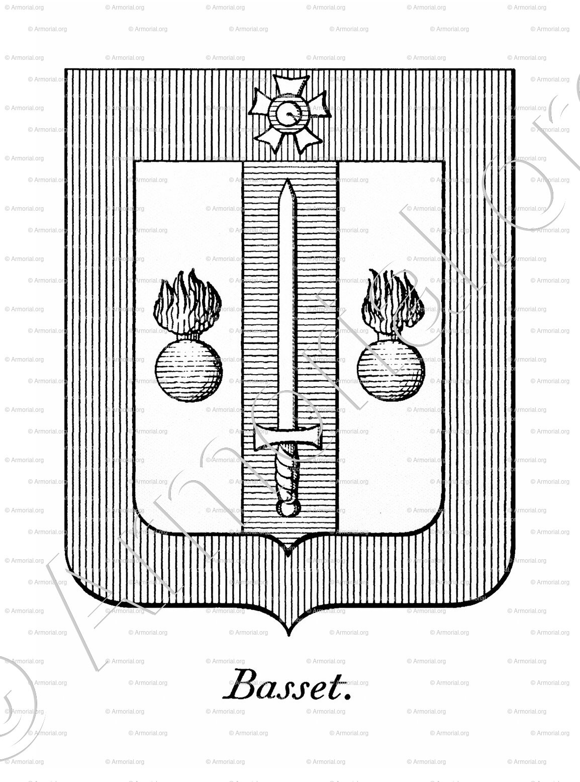 BASSET France : « D’argent, au pal d’azur, chargé d’une épée du champ et accosté de deux bombes du second, enflammées de gueules, à la bordure du dernier émail. »
