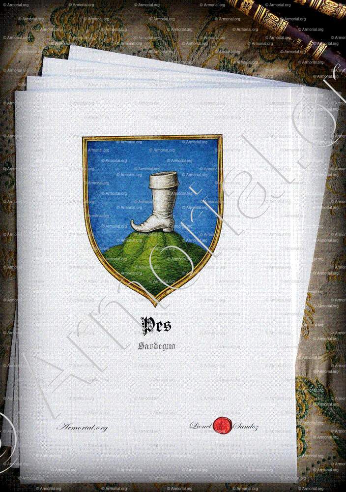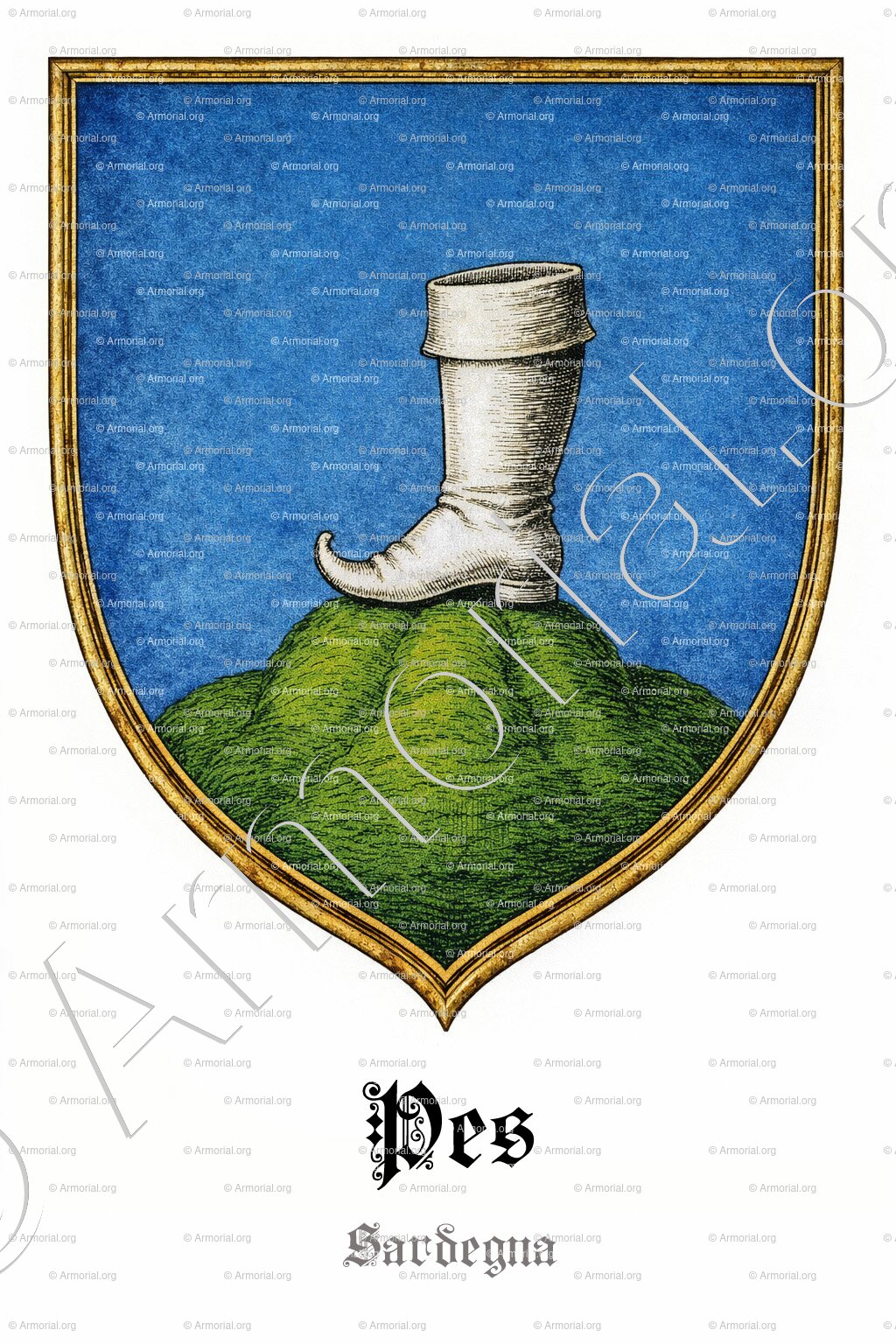 Le patronyme PES dérive directement du latin pes (pied) et du terme sarde pès de même sens. Il s’agit d’un nom caractéristique de la Gallura, région septentrionale de la Sardaigne, où il apparaît dès le XVIIe siècle au sein de la noblesse locale. Ce nom a donné lieu à des armes parlantes, illustrant de manière littérale l’étymologie du patronyme.
