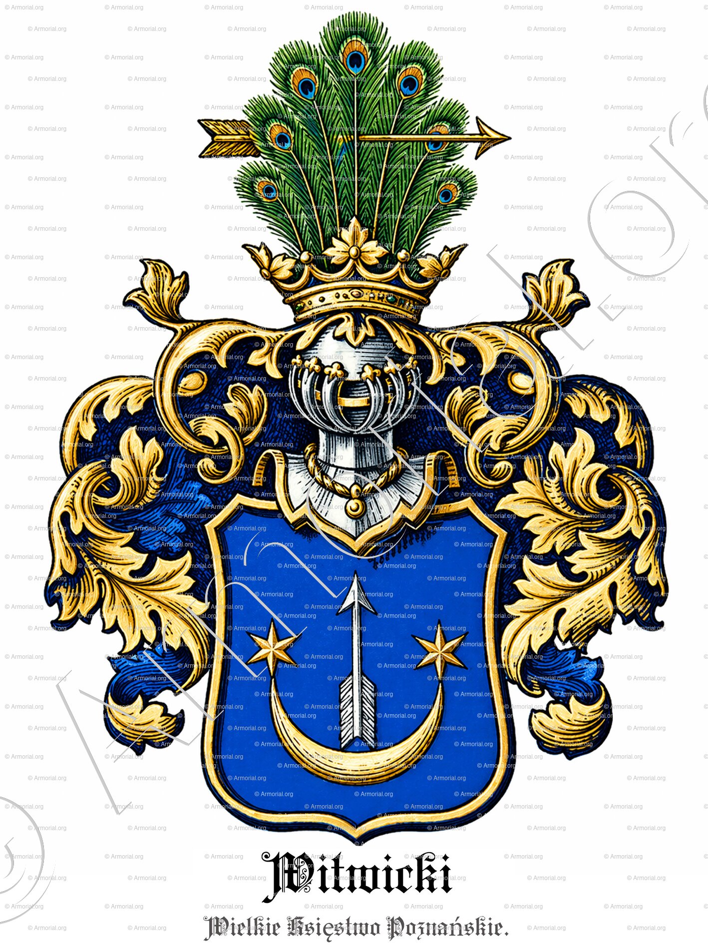 Klejnot: pawi ogon w barwach naturalnych, przeszyty poziomo strzałą złotą, grotem zwróconym w lewo (ku senestrowi).