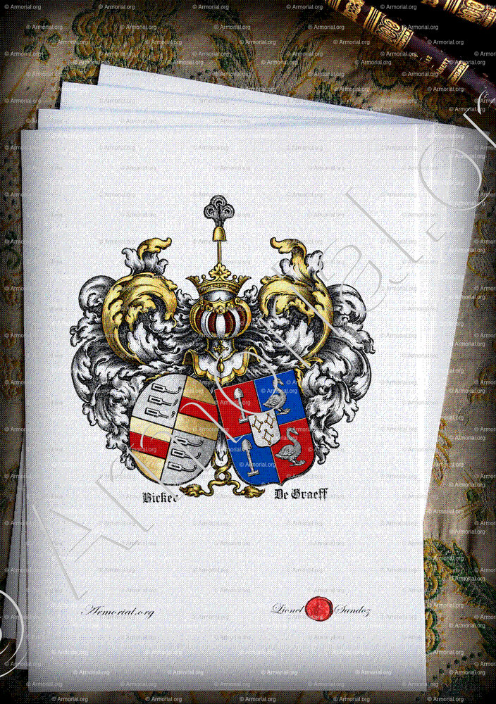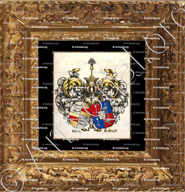 Recherche effectuée dans l’armorial.org de Lionel Sandoz, qui recense et documente les blasons des familles européennes, y compris les lignées néerlandaises DE GRAEFF (Van der Graeff) et BICKER. Les descriptions concordent avec les armoiries historiques gravées du XVIIe siècle représentant l’alliance matrimoniale.