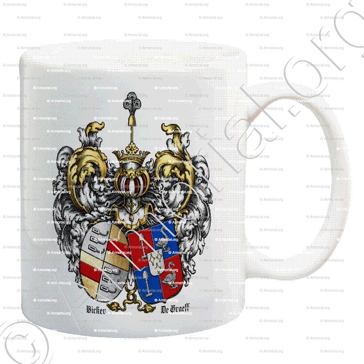La famille DE GRAEFF & BICKER représente l’alliance emblématique de deux grandes dynasties patriciennes d’Amsterdam aux Pays-Bas, dont le pouvoir s’est affirmé durant le Siècle d’or néerlandais (XVIIe siècle) au sein de la République des Provinces-Unies. Ces deux familles régentes, étroitement liées par de multiples mariages, ont formé le célèbre « clan BICKER-DE GRAEFF », un bloc politique et économique républicain influent qui a dominé la vie municipale d’Amsterdam et, par extension, la province de Hollande. Elles se sont opposées à l’autorité stadhoudérienne de la Maison d’Orange-Nassau et ont soutenu une politique libérale et mercantile, favorisant le commerce international via la VOC (Compagnie néerlandaise des Indes orientales). Cette combinaison armoriée symbolise notamment l’union de Pieter DE GRAEFF (1638-1707) et de Jacoba BICKER au XVIIe siècle, union qui scella durablement leur alliance. Les DE GRAEFF et les BICKER ont fourni de nombreux bourgmestres, régents et hommes d’État, marquant profondément l’histoire politique et culturelle des Provinces-Unies.