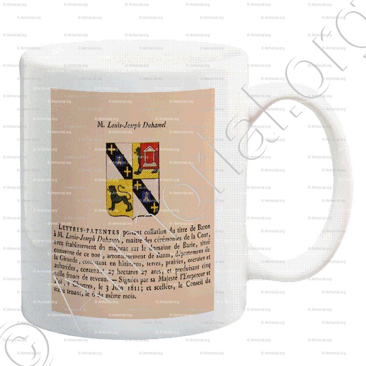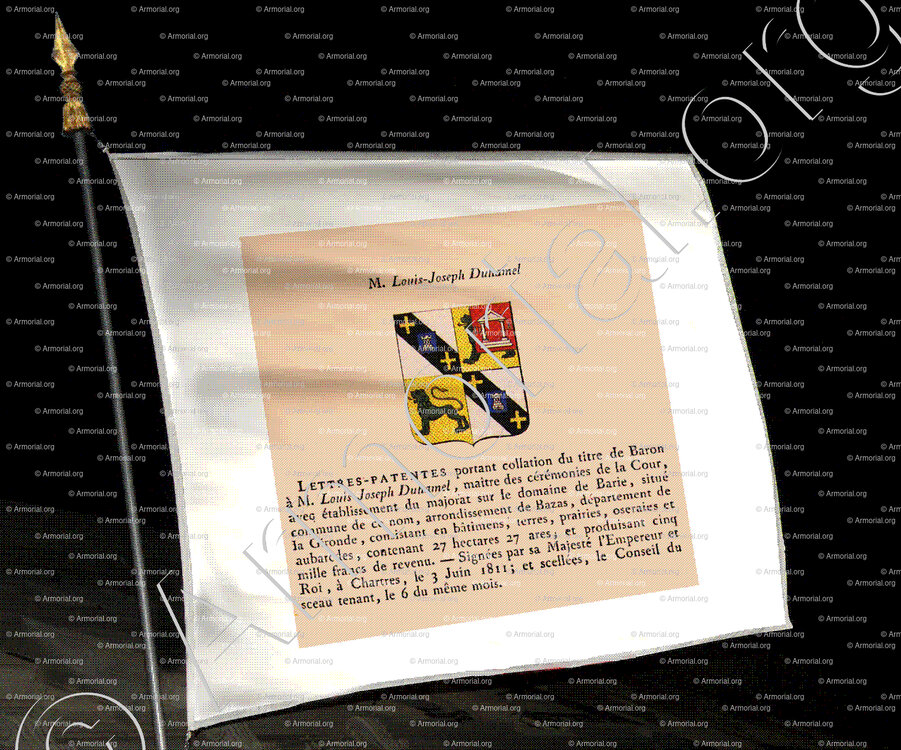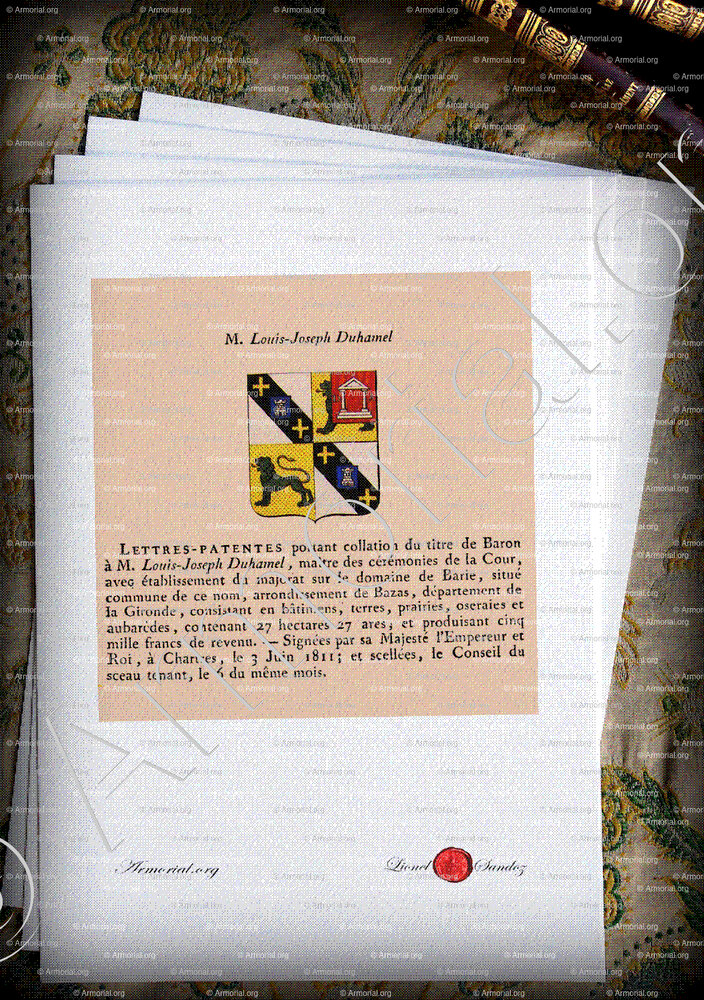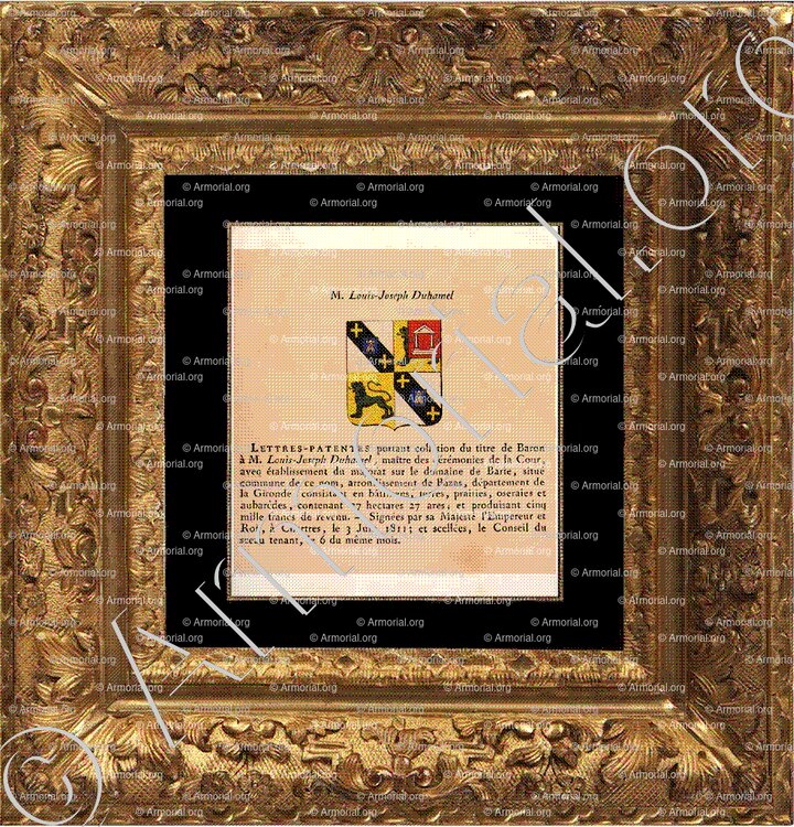 - Duhamel, Louis Joseph, Master of Ceremonies to the Emperor, Baron of the Empire, with majorat, Letters Patent of June 3, 1811, registered in the Senate (1808-1814) (National Archives)