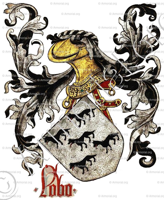 " De prata, com cinco lobos passantes de negro, armados e lampassados de vermelho, postos em sautor. "