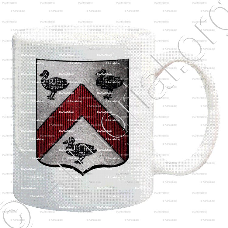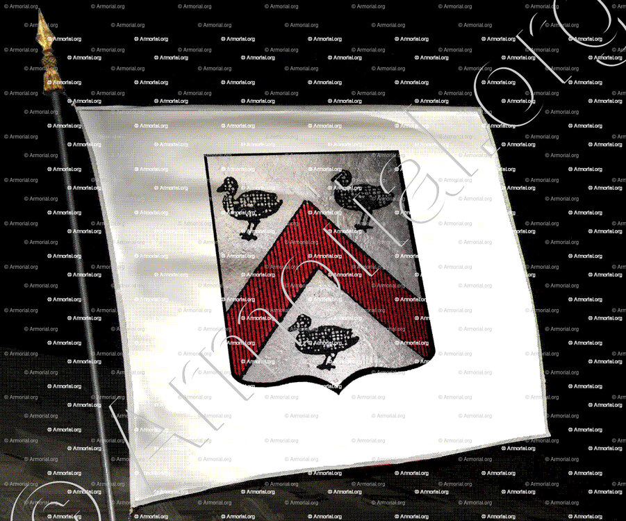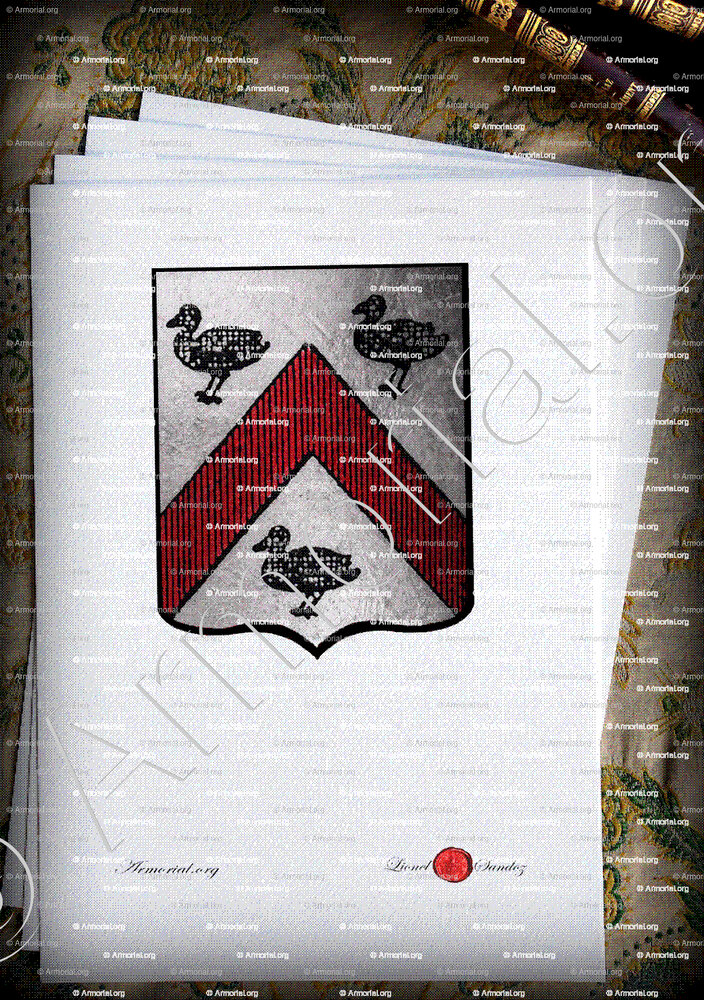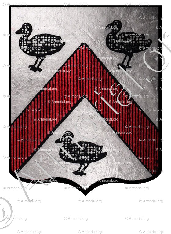 " D'argent, au chevron de gueules, accompagné de trois canettes de sable. "
