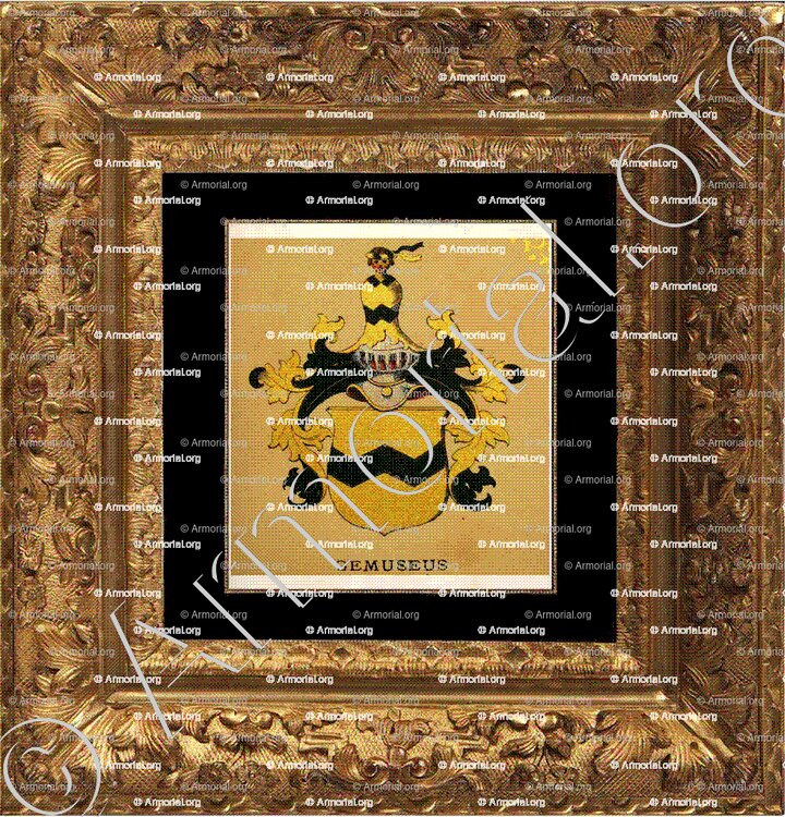 Cimier: un buste d'homme, habillé aux armes de l'écu, tortillé d'or et de sable.."