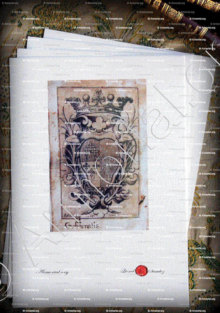 " Spaccato di rosso e d’argento, a sei crocette trifogliate col piede aguzzato : tre male ordinate nel primo, tre poste 2 e 1 nel secondo, dell’uno nell’ altro. "