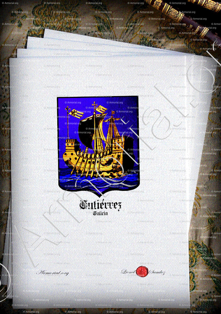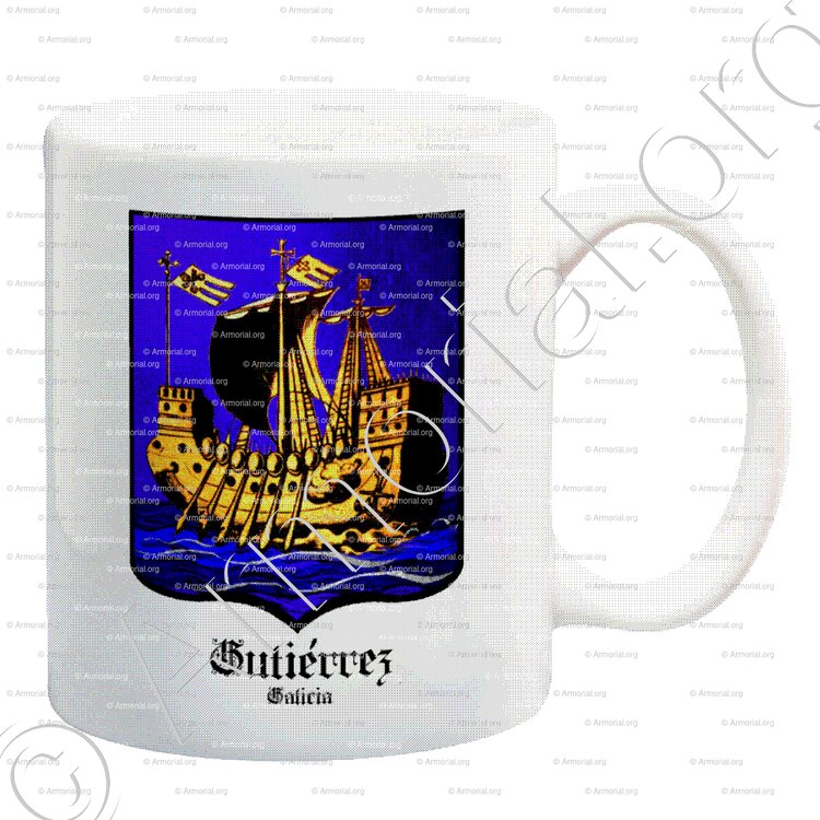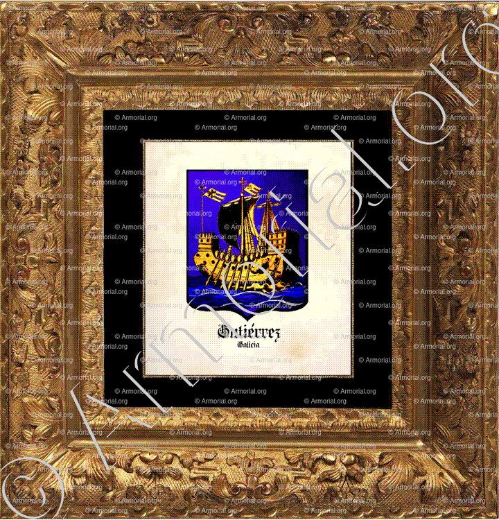 Cette description évoque un champ bleu chargé d'un navire doré naviguant sur des vagues alternant bleu et argent. D'autres variantes existent pour les GUTIÉRREZ galiciens (par exemple, cinq marcos d'argent sur azur), mais celle à la caravelle est spécifiquement associée à certaines lignées de Galice.