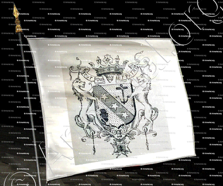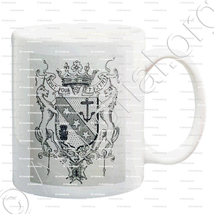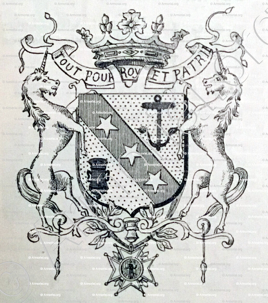 " D'or, à la bande de gueules chargée de trois étoiles d'argent accompagnée à senestre d'une ancre de sable et à dextre d'une bombarde du mesme."