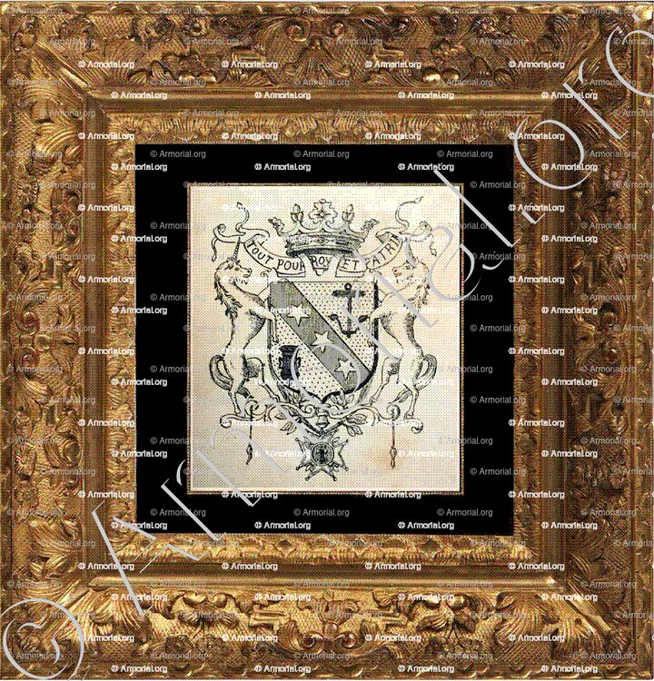 " D'or, à la bande de gueules chargée de trois étoiles d'argent accompagnée à senestre d'une ancre de sable et à dextre d'une bombarde du mesme."
