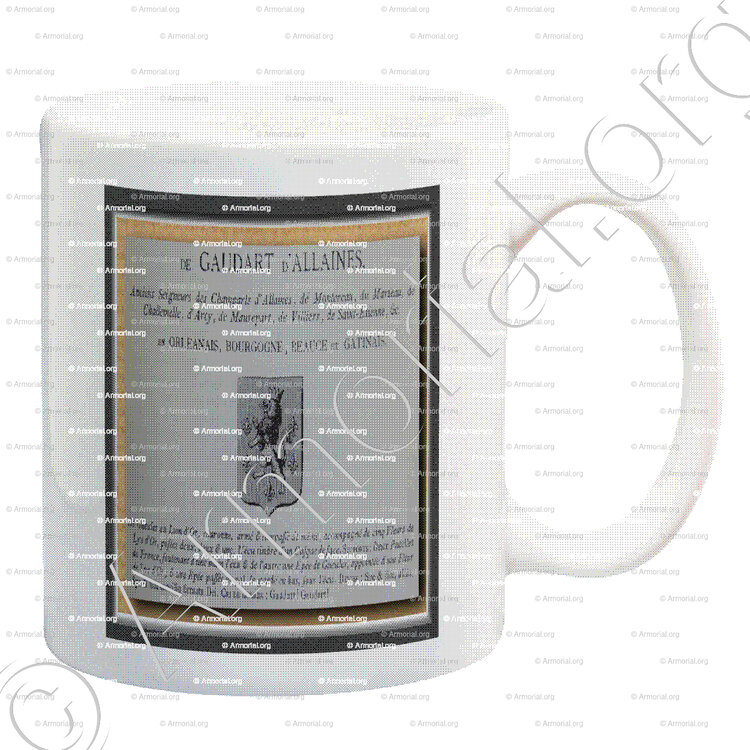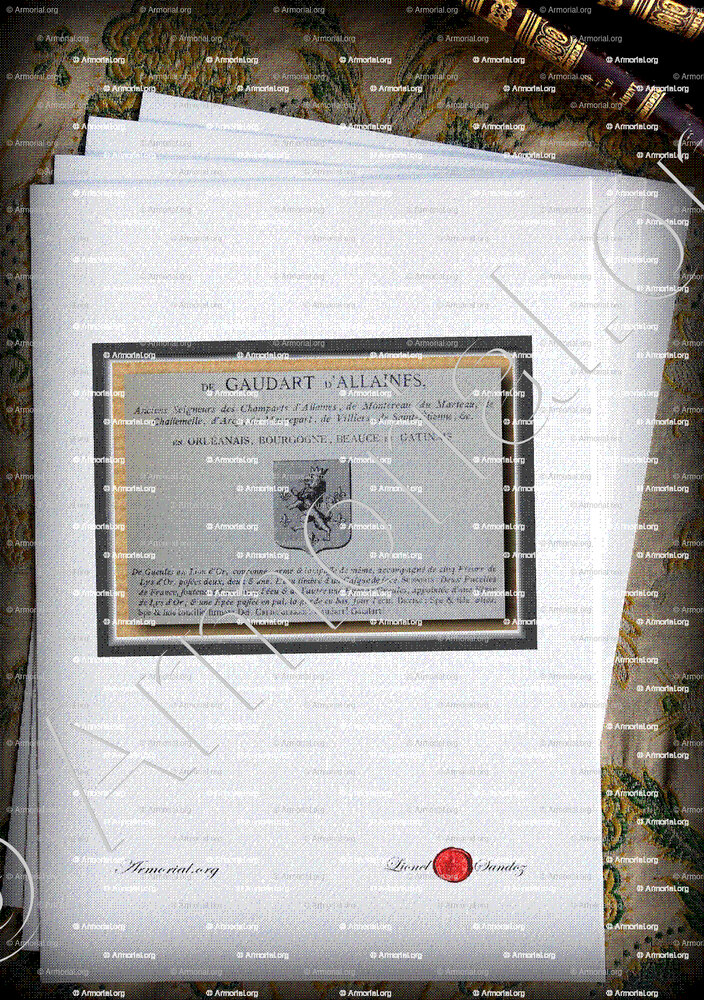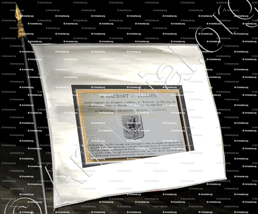- Tenants: deux pucelles de France soutenant d'une main l'écu, de l'autre une épée de gueules appointée d'une fleur-de-lys d'or, celle à dextre assise, celle, à senestre debout, et une épée posée en pal la garde en bas sous l'écu.