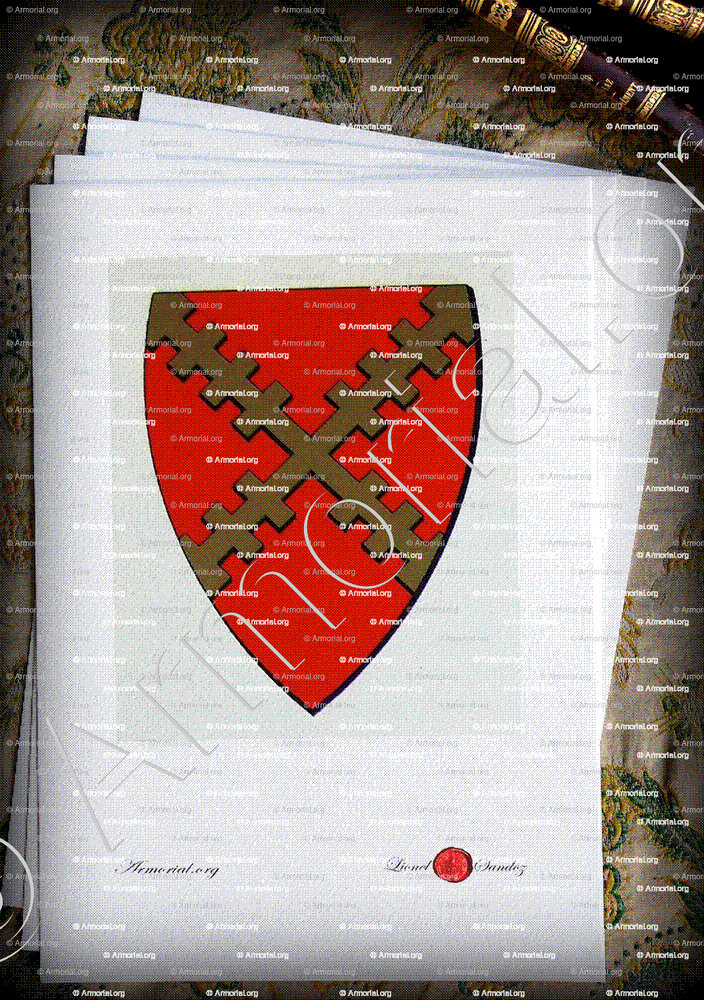 " De gueules à un croix de Saint-André crénelée d'or ."