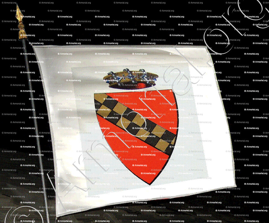 " De gueules à la bande échiquetée de deux tires d'or et de sable."