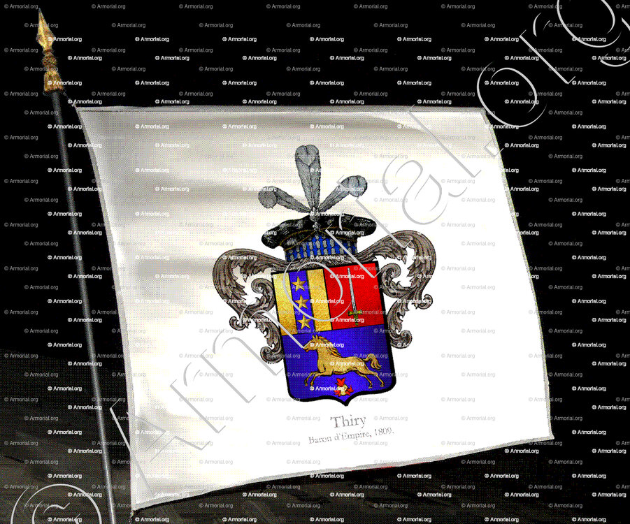 " Coupé: au 1, d'or, au pal d'azur, chargé de trois étoiles d'argent; au 2, d'azur, à un cheval galopant d'or, accompagné en pointe d'une grenade d'or, allumée en trois endroits de gueules. "
