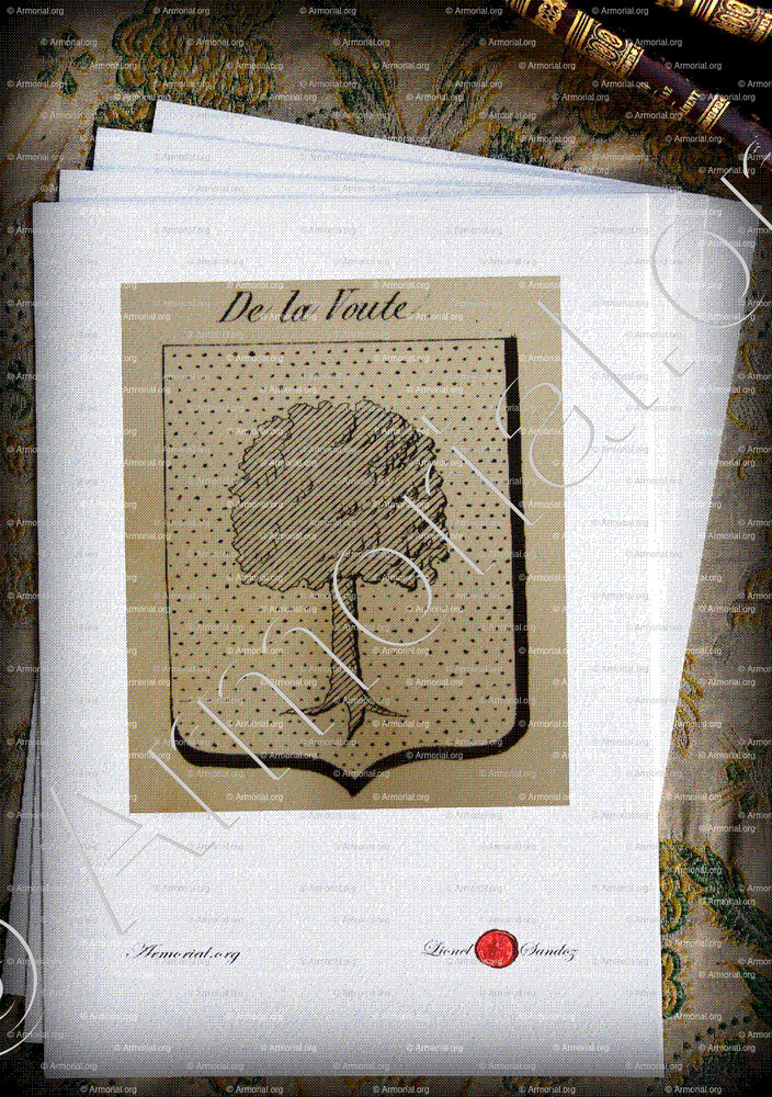 - Le blason de la famille de LA VOÛTE est ainsi décrit : d'or, à l'arbre de sinople. Une similitude notable est observée avec les armoiries des Chassaing, qui diffèrent uniquement par l’émail du champ de l’écu, lequel est d'argent chez ces derniers, marquant ainsi une brisure significative. Ces distinctions sont mentionnées dans l’Armorial de 1450 (D. Coll. Noms féodaux, p. 409).