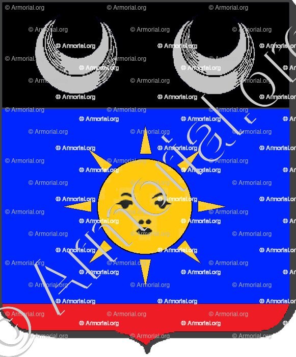 " D'azur à un soleil animé à huit rais triangulaires d'or; au chef de sable à deux croissants d'argent; et une terrasse de gueules".