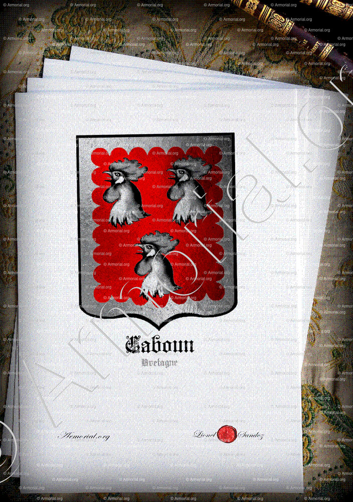 Chapon/Coq : En héraldique, le chapon (coq castré) ou le coq symbolise la vigilance (car il annonce l’aube), le courage et parfois la fertilité ou la prospérité agricole. Sa présence dans les armoiries des Caboun/Cabon/Capon suggère une connexion avec des valeurs rurales ou une identité liée à la terre.
