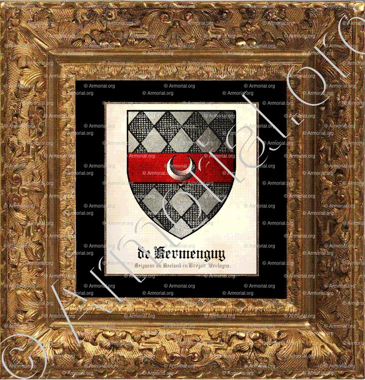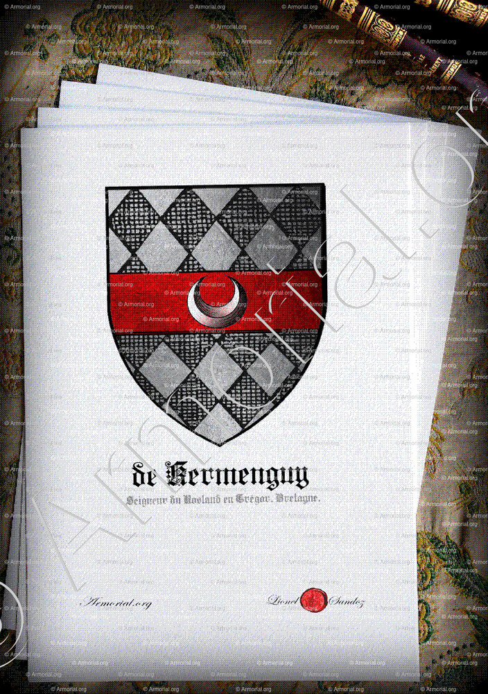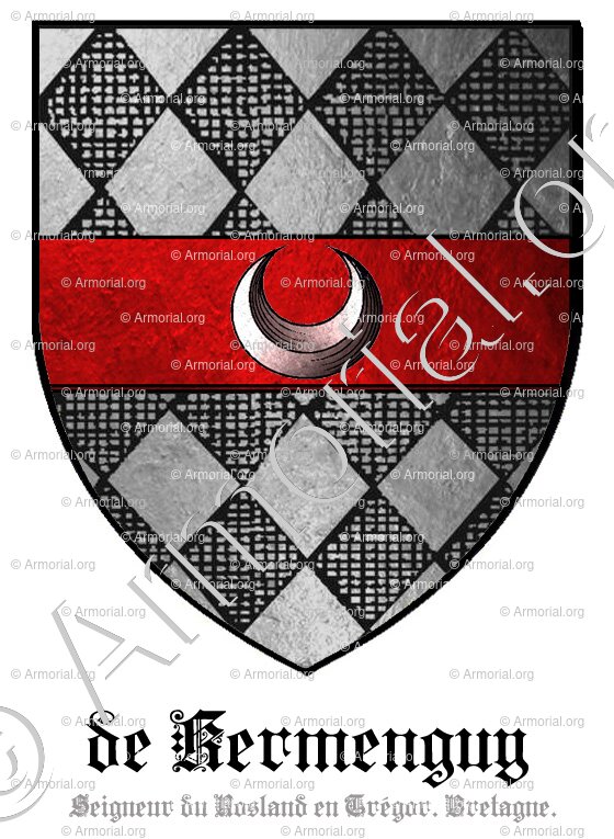 Les Kermenguy dit de Saint-Laurent le sont par alliance pour les distinguer à une époque des Kermenguy (de Kermenguy) et il serait faux de leur attribuer des armes qui sont celles des Kermenguy de Kermenguy puisque nous portons le nom de notre terre depuis le 15° siècle. La branche dont parle l’armorial est issue de Rolland qui était entre autre seigneur du Rosland en Trégor (qui venait par une alliance avec les Goësbriand). N’ayant plus de descendance de la branche ainée à Kermenguy, cette branche du Trégor est revenue en Léon ensuite et nous en descendons.