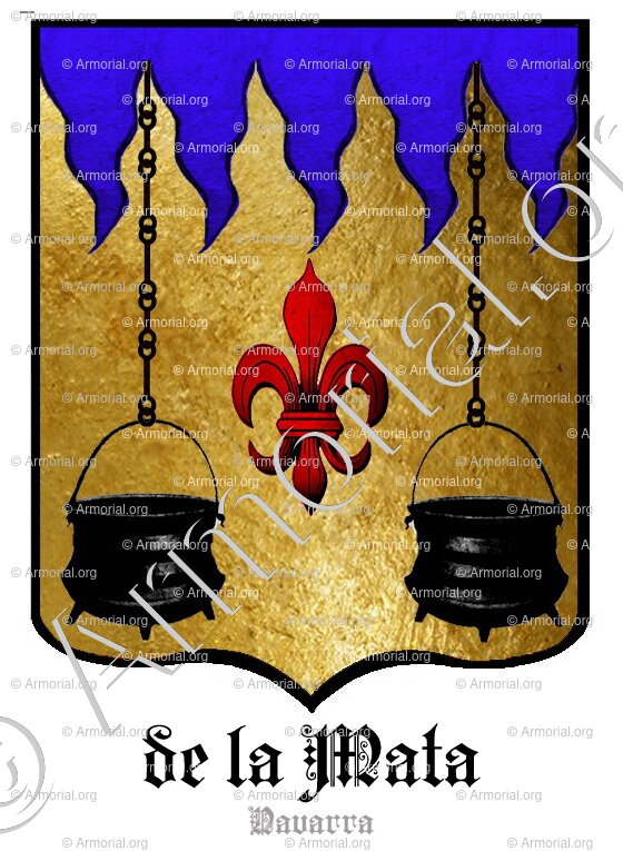 " En oro, dos calderas, de sable, colgadas de cadenas del mismo color, y, entre las dos calderas, una flor de lis, de gules; en el jefe, cinco jirones de azur. "