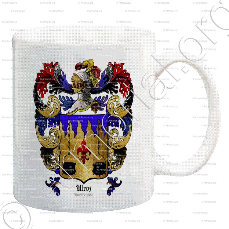 Entre los dos calderos, una flor de lis de gules, y en el jefe, cinco jirones de azur. "