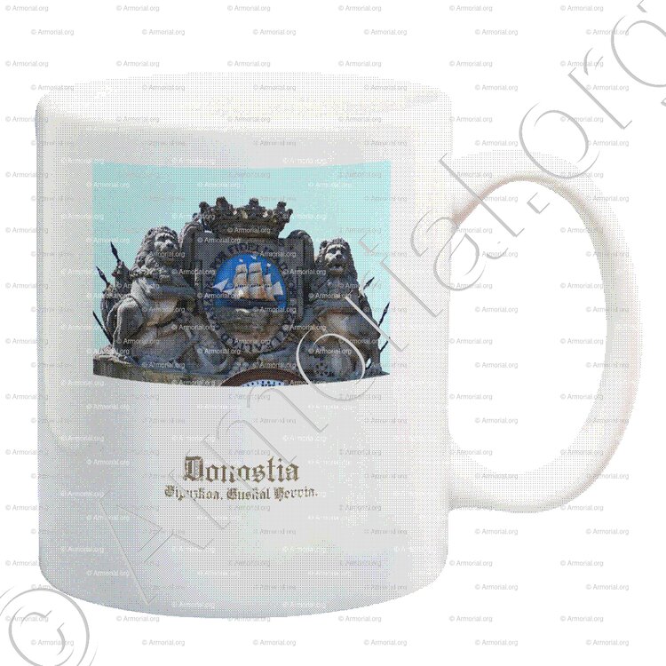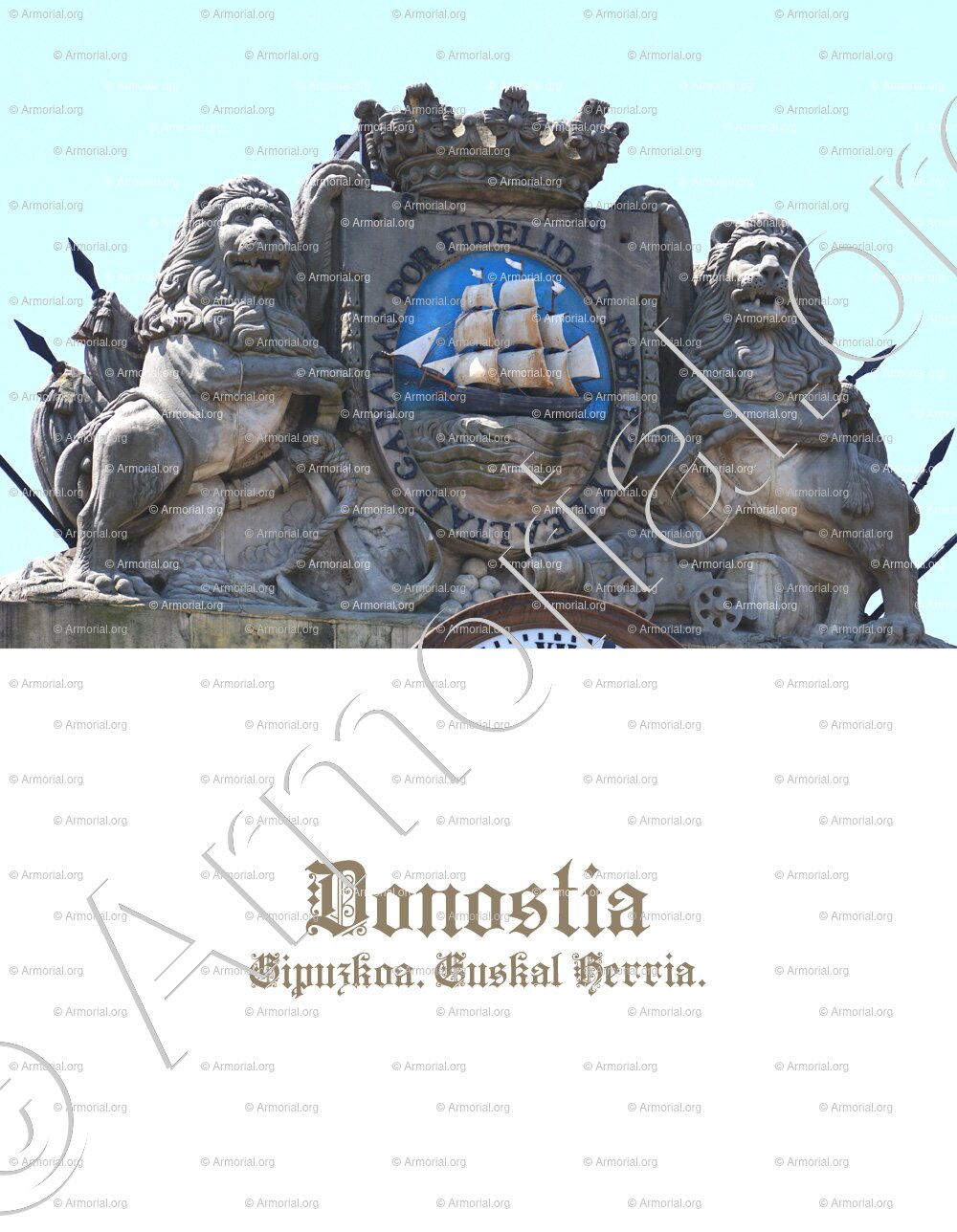 Escudo municipal de Donostia-San Sebastián (Guipúzcoa, España) según el siguiente blasonado: En campo de azur, sobre ondas de azur y plata, un bergantín, de oro, de tres palos, habillado de plata y acompañado de las letras SS, de plata, una en cada cantón. Bordura de plata con la leyenda "Ganadas por fidelidad, nobleza y lealtad", en letras de sable. Al timbre, Corona Real cerrada, que es un círculo de oro, engastado de piedras preciosas, compuesta de ocho florones de hojas de acanto, visible cinco, interpoladas de perlas y de cuyas hojas salen sendas diademas sumadas de perlas, que convergen en el mundo de azur o azul, con el semimeridiano y el ecuador en oro, sumado de cruz de oro. La corona forrada de gules o rojo.; fuente: Ampelio Alonso Cadenas López, Vicente Cadenas Vicent,Heráldica de las comunidades autónomas y de las capitales de provincia, pag. 128, Ed. Hidalguía, Madrid 1985,