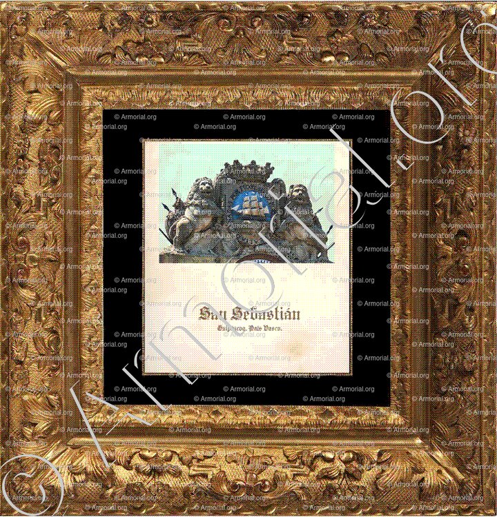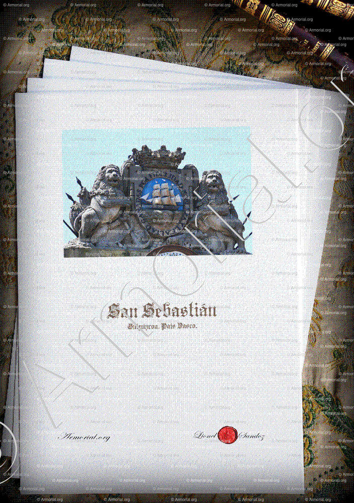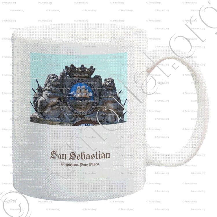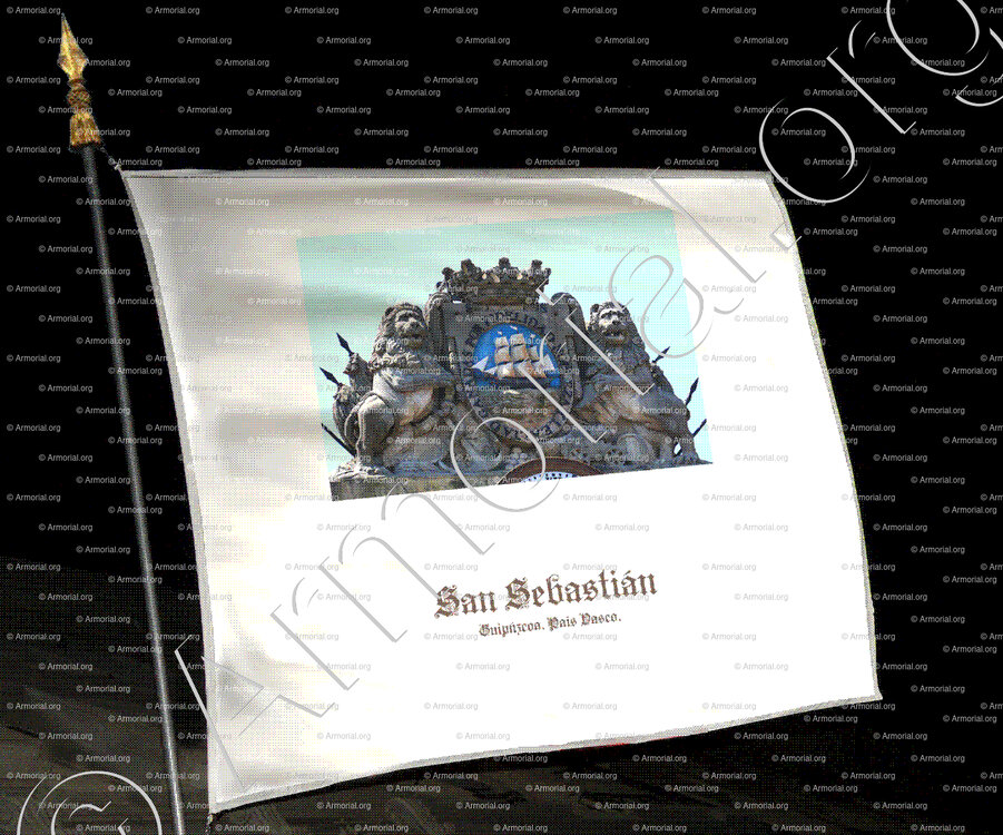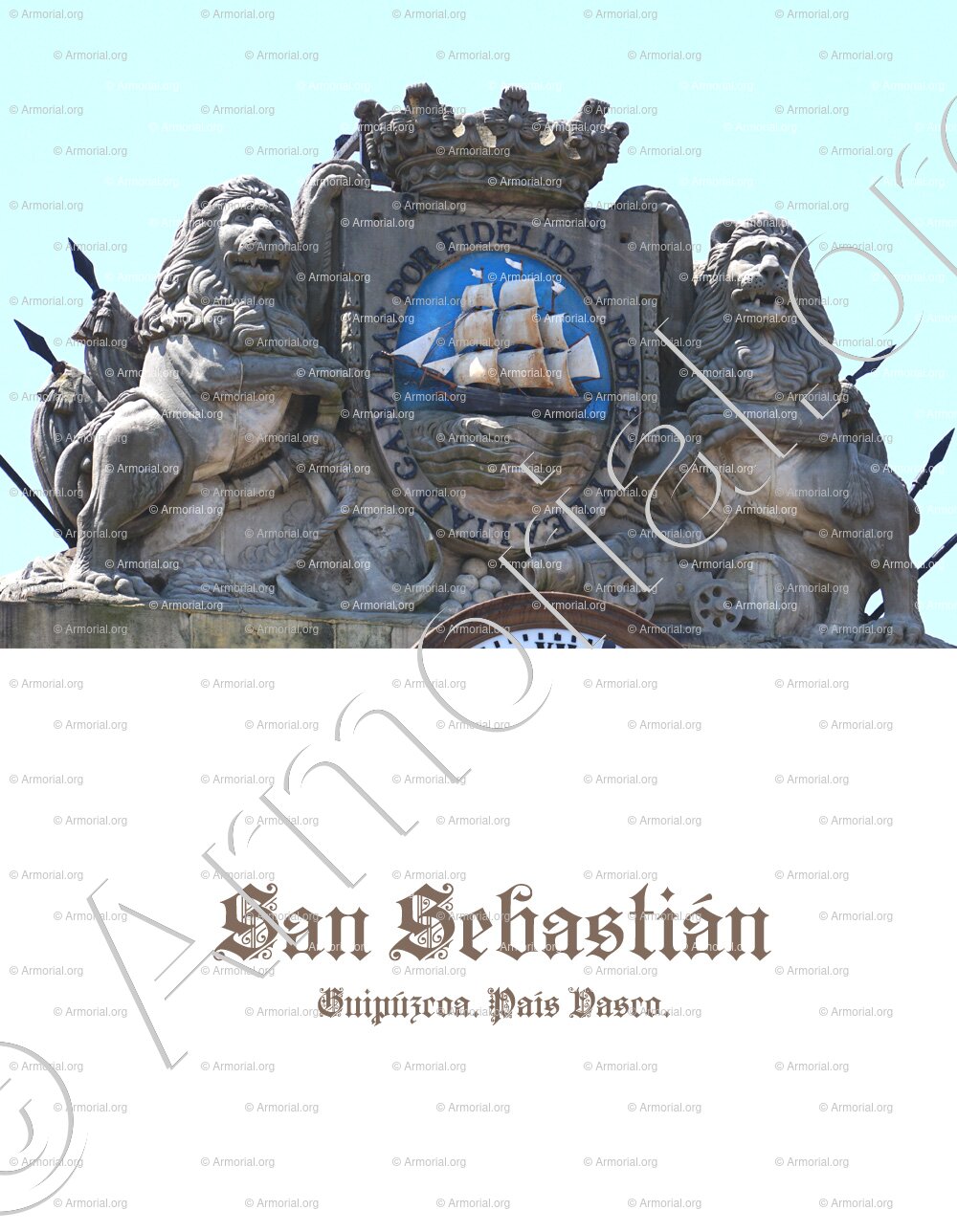 Escudo municipal de Donostia-San Sebastián (Guipúzcoa, España) según el siguiente blasonado: En campo de azur, sobre ondas de azur y plata, un bergantín, de oro, de tres palos, habillado de plata y acompañado de las letras SS, de plata, una en cada cantón. Bordura de plata con la leyenda "Ganadas por fidelidad, nobleza y lealtad", en letras de sable. Al timbre, Corona Real cerrada, que es un círculo de oro, engastado de piedras preciosas, compuesta de ocho florones de hojas de acanto, visible cinco, interpoladas de perlas y de cuyas hojas salen sendas diademas sumadas de perlas, que convergen en el mundo de azur o azul, con el semimeridiano y el ecuador en oro, sumado de cruz de oro. La corona forrada de gules o rojo.; fuente: Ampelio Alonso Cadenas López, Vicente Cadenas Vicent,Heráldica de las comunidades autónomas y de las capitales de provincia, pag. 128, Ed. Hidalguía, Madrid 1985,