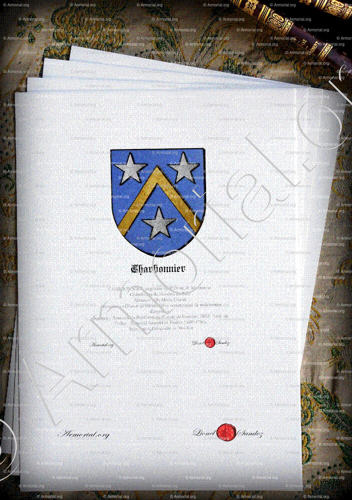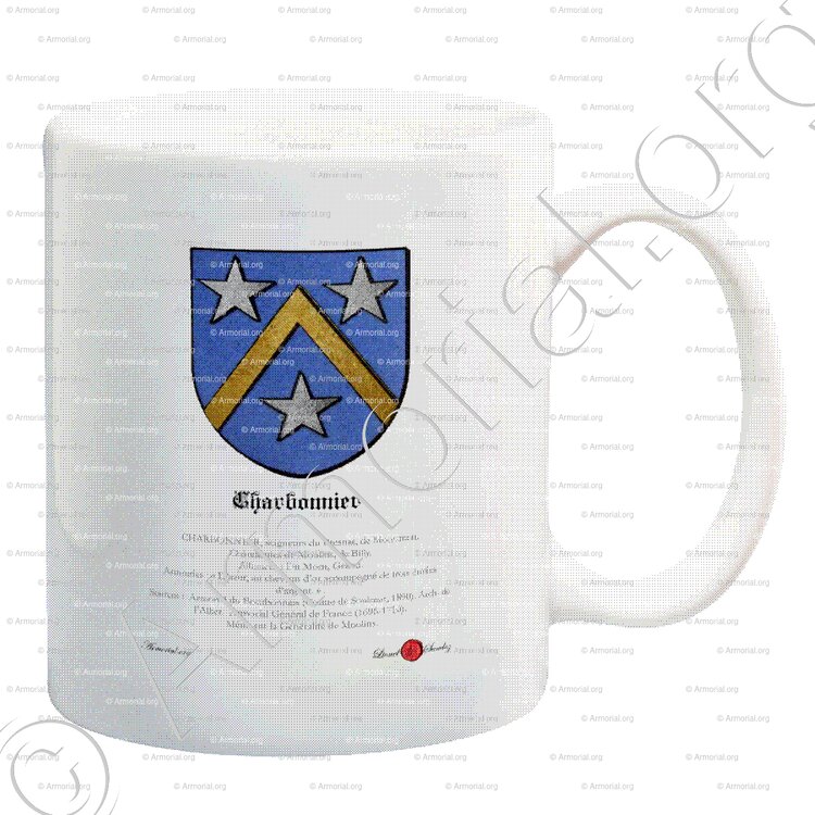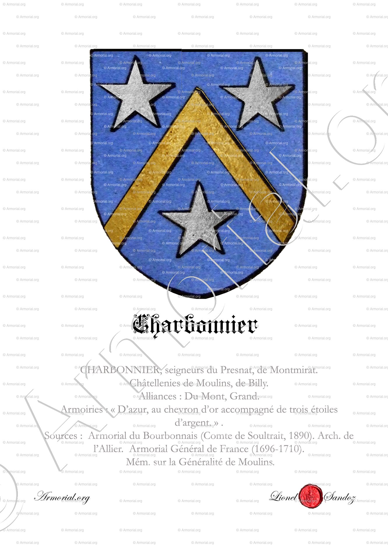 - Notice armoriale CHARBONNIER (souche Bourbonnais, alliances Du Mont, Grand ; blason d’azur au chevron d’or et trois étoiles d’argent). (Armorial.org)