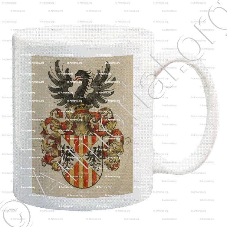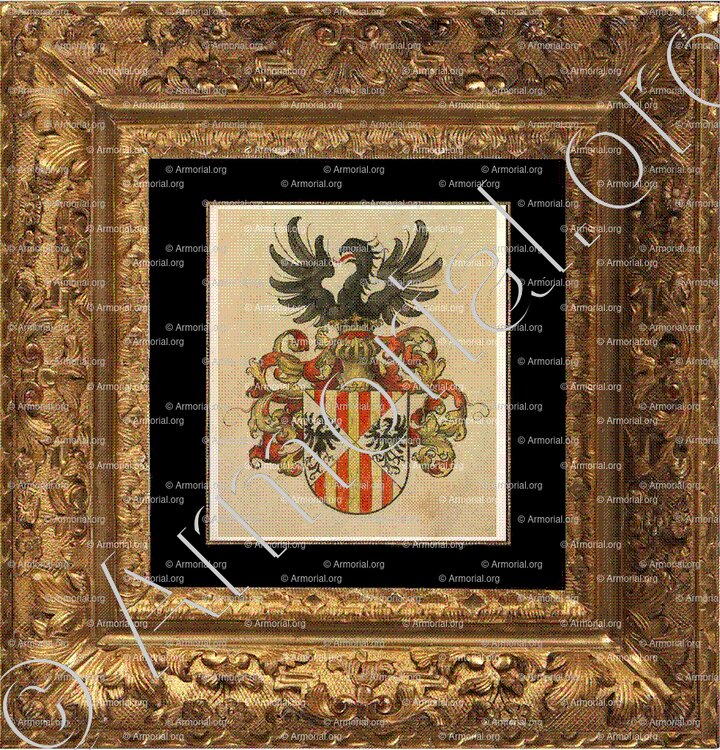 " D'or, à quatre pals de gueules (qui est d'Aragon), flanqués de deux aigles de sable ".