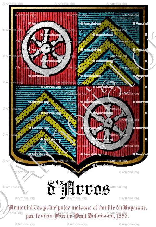 Origine du blason " d'ARROS " : " Armorial des principales maisons et familles du Royaume, par le sieur Pierre-Paul Dubuisson, 1757., France, Europe () "