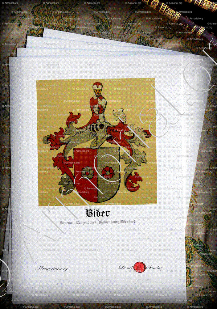 " Parti au 1° de gueules, à une rose d'argent au coeur de gueules, au 2° d'argent à une rose de gueules au coeur d'argent. "