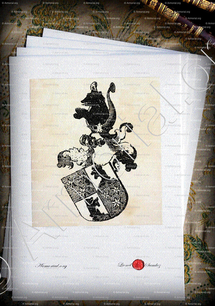Cimier: un ours issant de sable, entre deux proboscides d'or et d'azur.