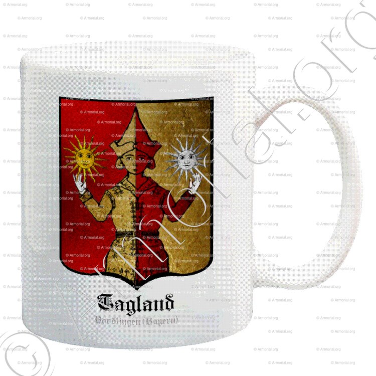 " Parti de gueules et d'or, à un homme issant, coiffé d'un bonnet pointu, de l'un en l'autre, supportant de chaque main un soleil de l'un à l'autre. "