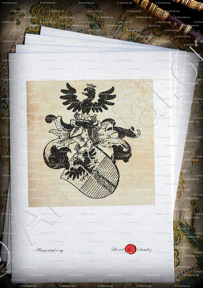 " Coupé: au 1, d'or, à une aigle de sable; au 2, d'azur, à un trépied de gueules duquel s'élèvent des flammes du même. "