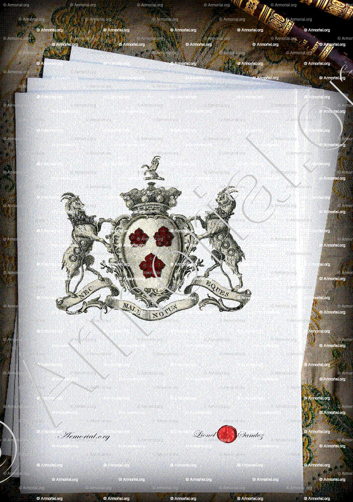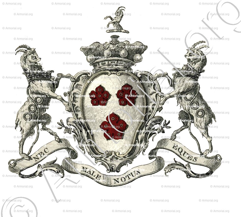 Supports: deux boucs pareils à celui du cimier, enchaînés de gueules.