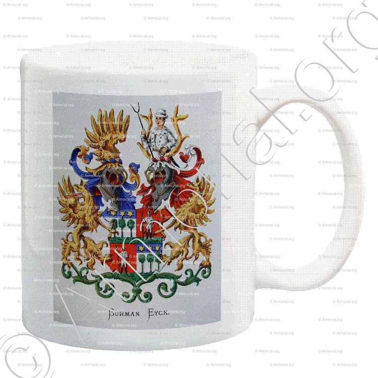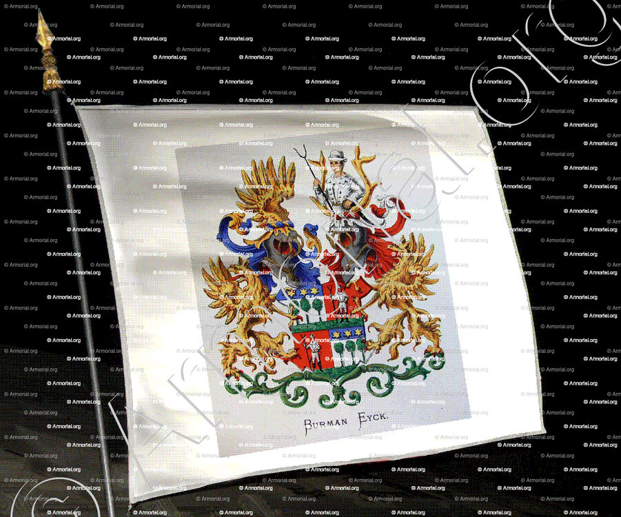 " Écartelé: aux 1 et 4, d'argent, à trois chênes de sinople, rangés sur une terrasse du même, au chef d'azur, ch. de trois étoiles d'or (Eyck); aux 2 et 3, de gueules, à un homme d'argent, l'épée au côté, la tête coiffée d'une casquette, tenant de sa main dextre une fourche d'or, et soutenu d'une terrasse de sinople (Burman) ".