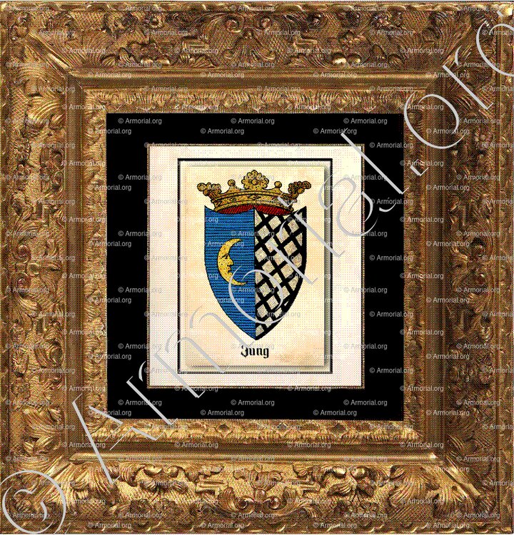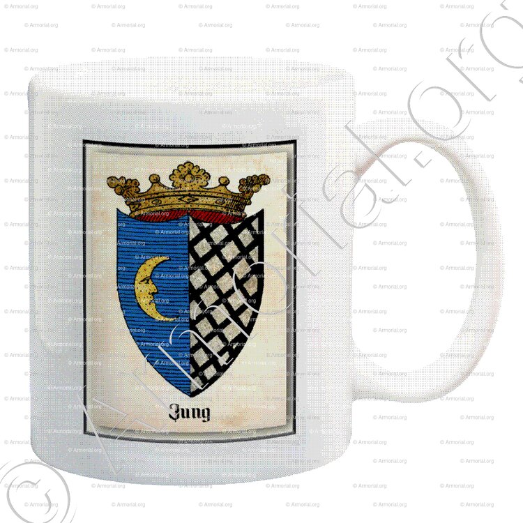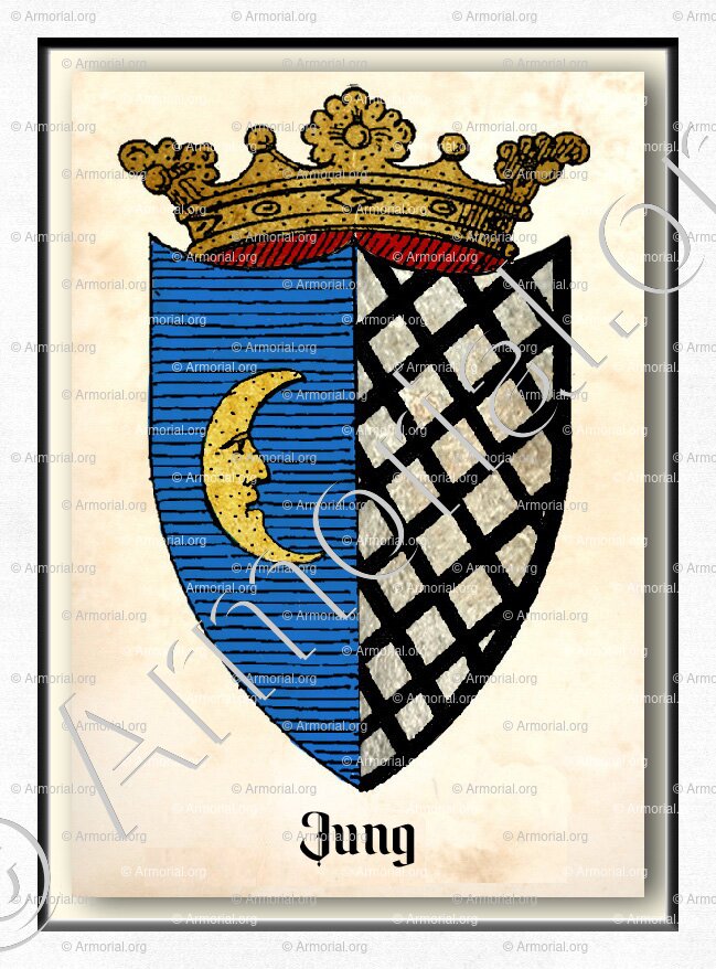 " Parti: au 1, d'azur, à un croissant figuré contourné d'or; au 2, d'argent, treillissé de sable, cloué de gueules. "