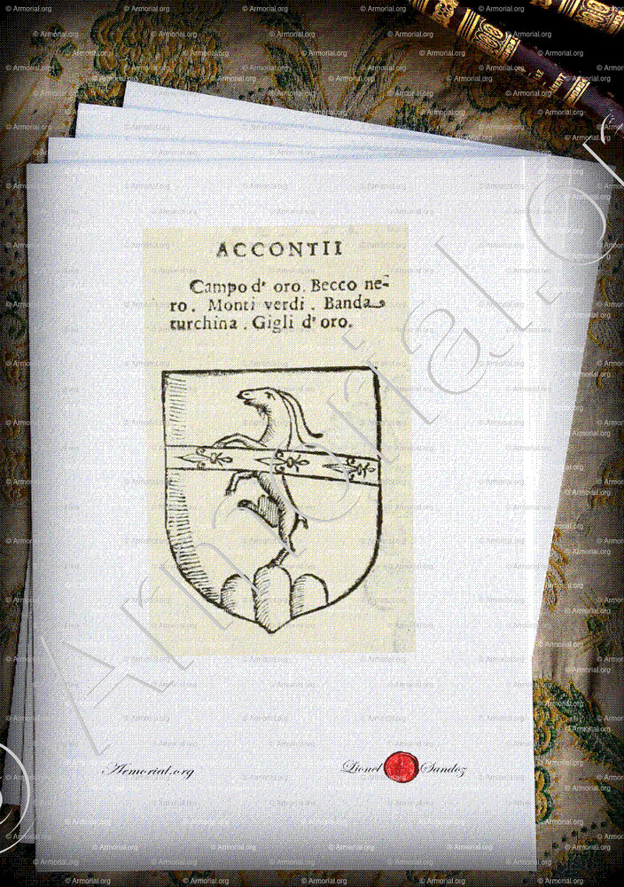 Famille ACCONTII - Blason ACCONTII - Blasonnement ACCONTII - Armoiries ACCONTII - Armoiries de famille ACCONTII - Armorial ACCONTII - Armes ACCONTII - Armes sur un écu ACCONTII - Ecu ACCONTII - Ecus armoriés ACCONTII - Bannière, flanchières, caparaçon armoriés ACCONTII - Bouclier armorié ACCONTII - Sceau ACCONTII - Sceau armorié ACCONTII - Archives ACCONTII - Généalogie ACCONTII - Arbre généalogique ACCONTII - Ascendance ACCONTII - Descendance ACCONTII - Héraldique ACCONTII - Origine ACCONTII - Les ACCONTII dans l'Histoire - Les ACCONTII dans la noblesse - Devise ACCONTII - Armoiries de bourgeoisie ACCONTII - Armoiries de noblesse ACCONTII.