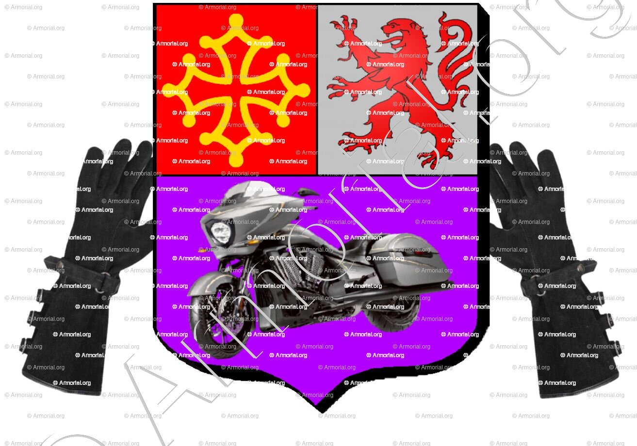 " Coupé: au premier parti, au 1 de gueules à la croix occitane d'or, et au 2 d'argent au lion du premier (gueules); au second de pourpre à une moto au naturel d'argent "