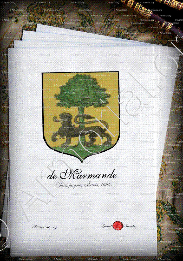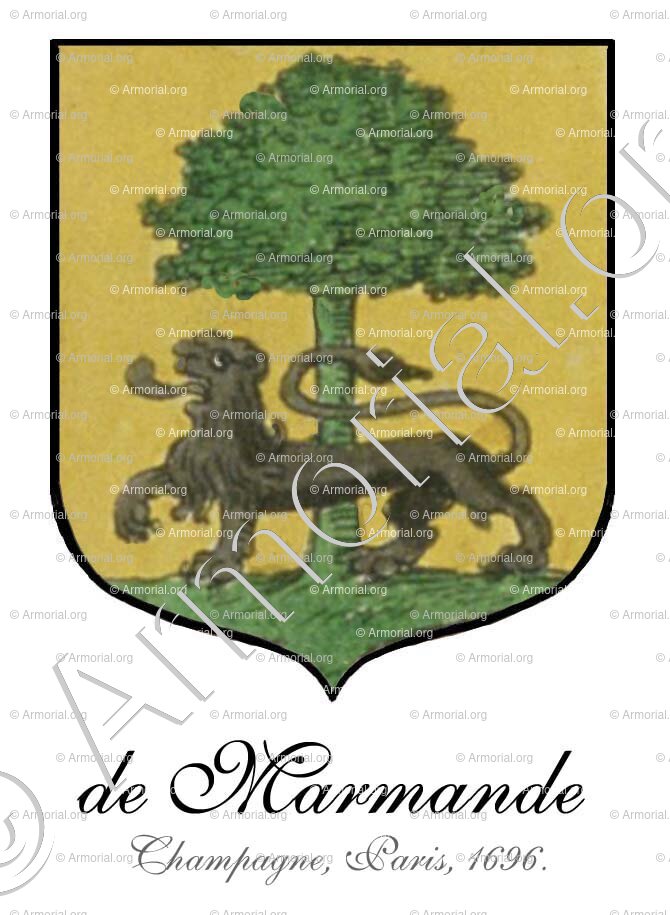 - Les Armes qui ont été réglées par les Commissaires du Roi, sur le fait des Armoiries, le 18 Janvier 1698 pour ledit Claude de Marmande, & dont ledit François-Claude de Marmande, son fils est en droit de jouir par ses priviléges, sont :