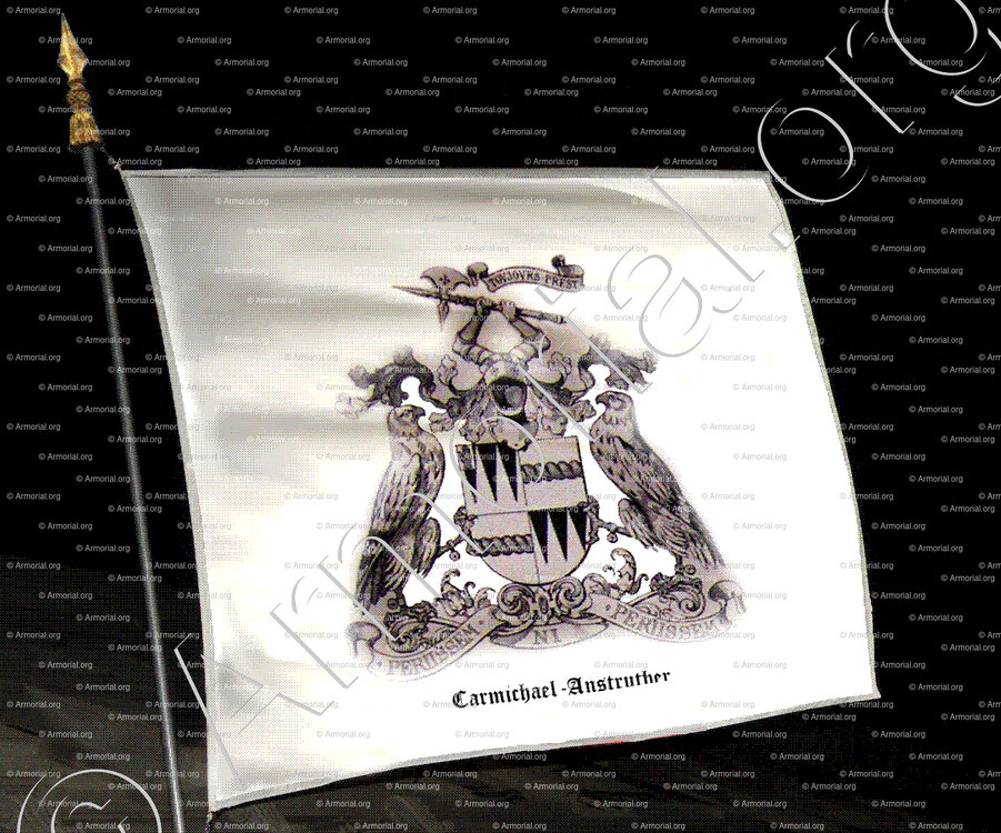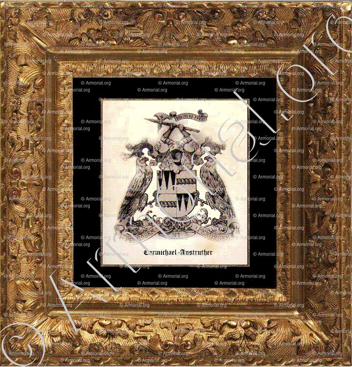 - Cimiers: 1° deux bras, armés et gantelés, brandissant une hache d'armes (Anstruther); 2° un bras, armé, le coude à dextre, la main tenant une lance rompue (Carmichael).