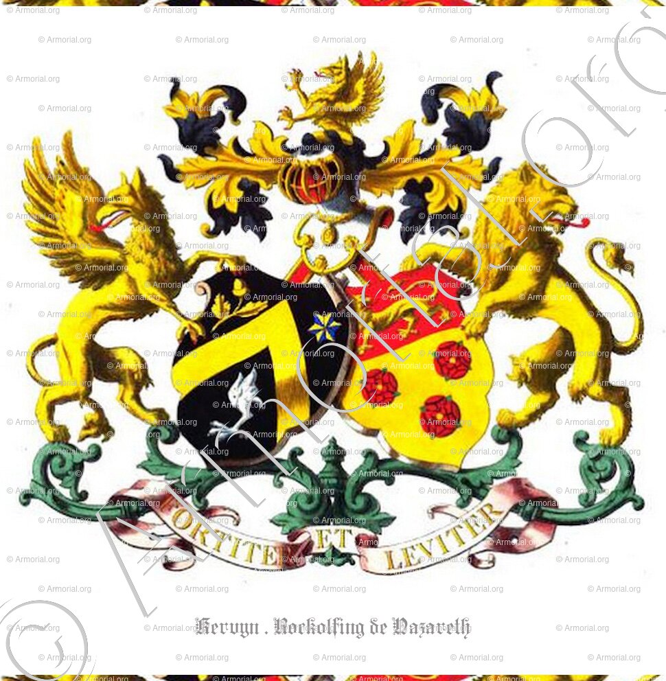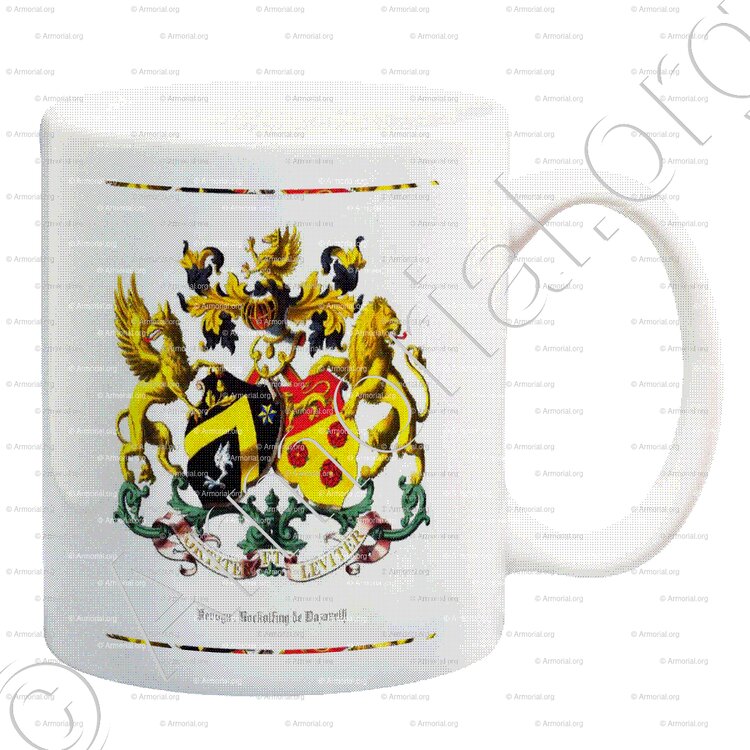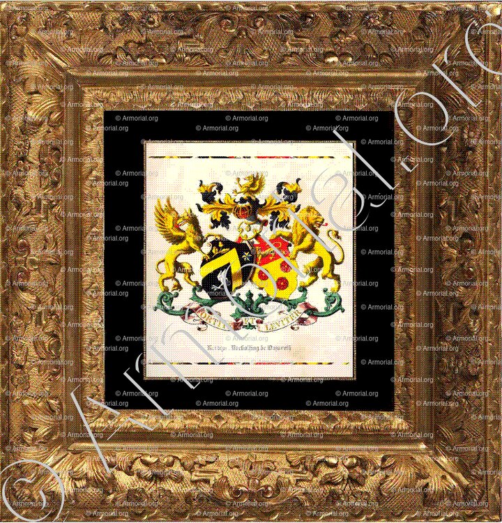 - Cimier: un lion issant d'or, lampassé de gueules, la tête contournée, entre un vol à l'antique, d'or et de gueules.