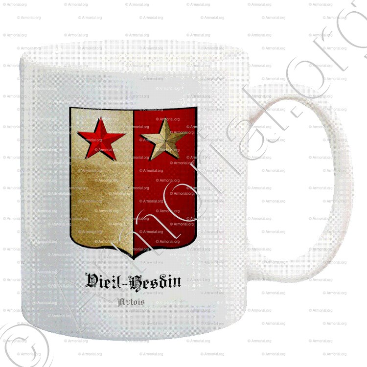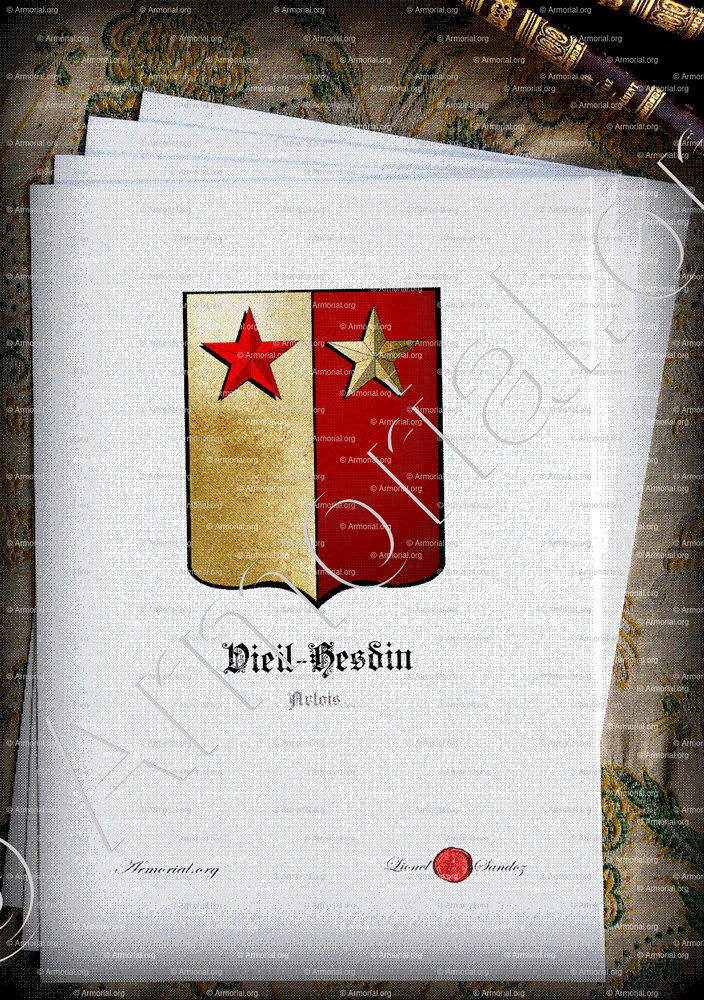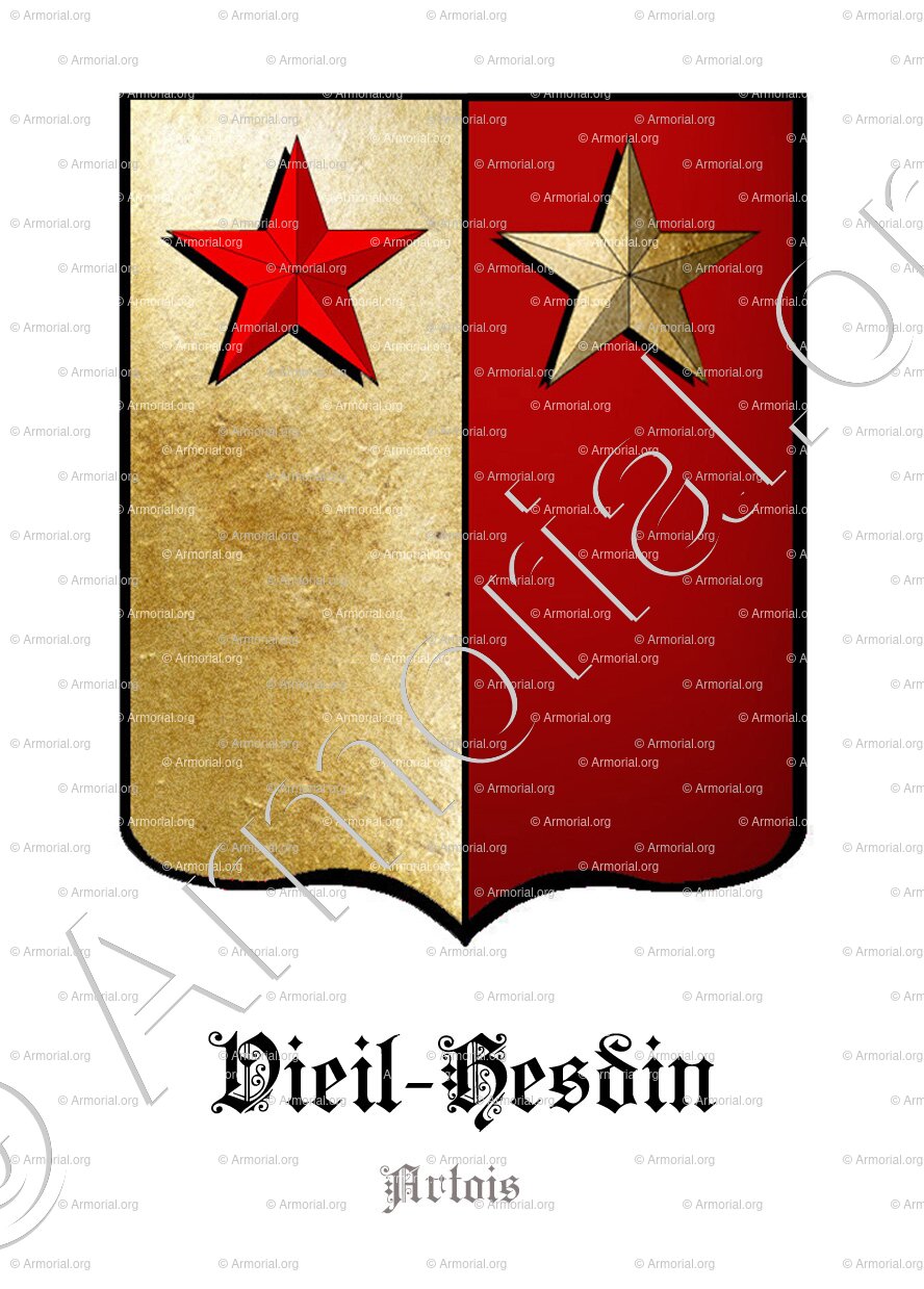 " Parti d'or et de gueules à 2 étoiles en chef de l'un en l'autre. "