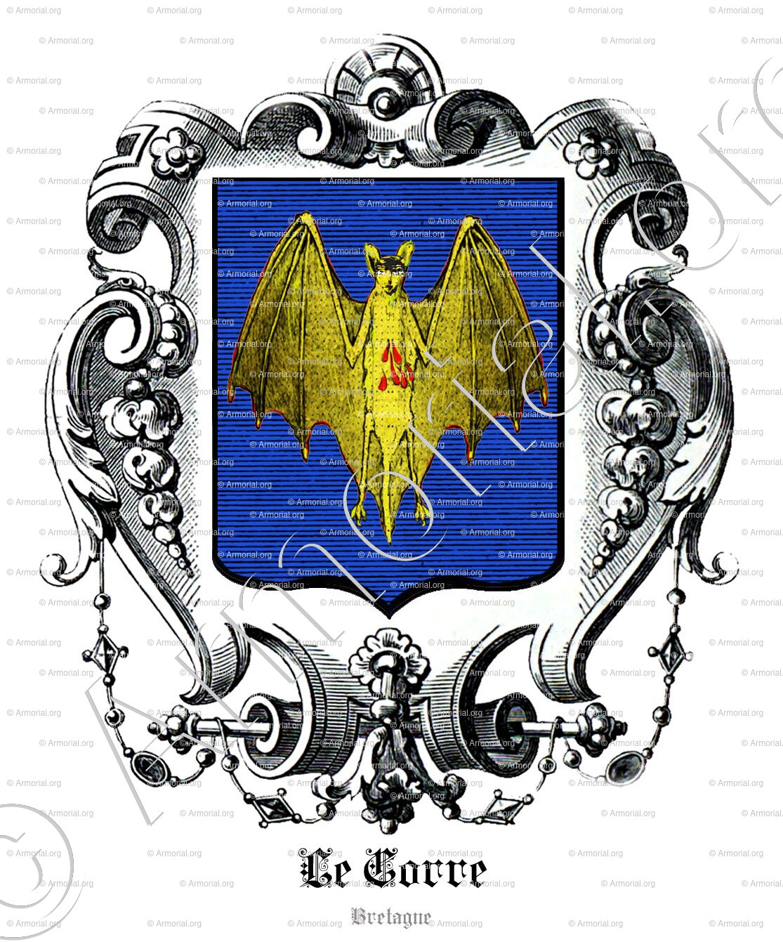 " D'azur, à une chauve-souris d'or, éployée en pal, l'estomac percé de gueules. "