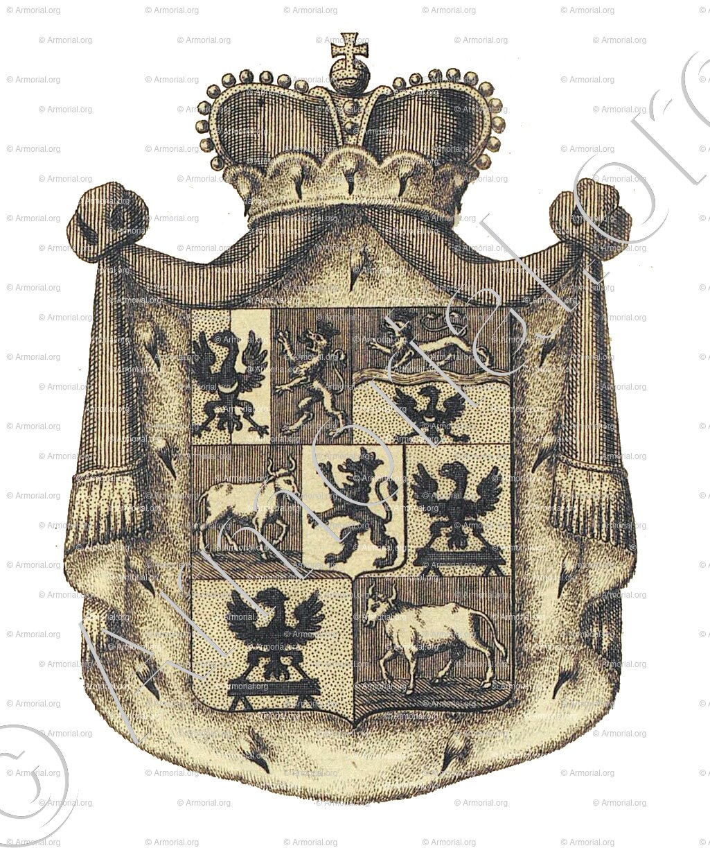 " Écartelé: aux 1 et 4, de gueules, au boeuf d'or, bouclé du même, passant sur une terrasse de sinople, celui du 1 contourné; aux 2 et 3, d'or, à l'aigle de sable, couronnée du champ, soutenue d'un banc à quatre pieds du second. Sur le tout d'azur à la couronne d'or. "