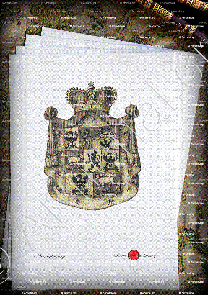 - Lambrequin: d'or et de sable; 3° le lion, issant.