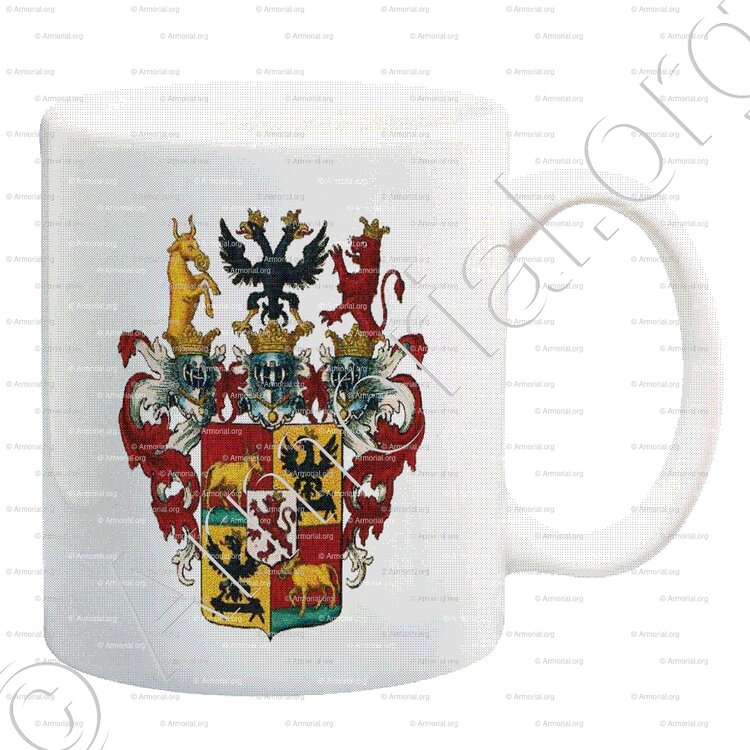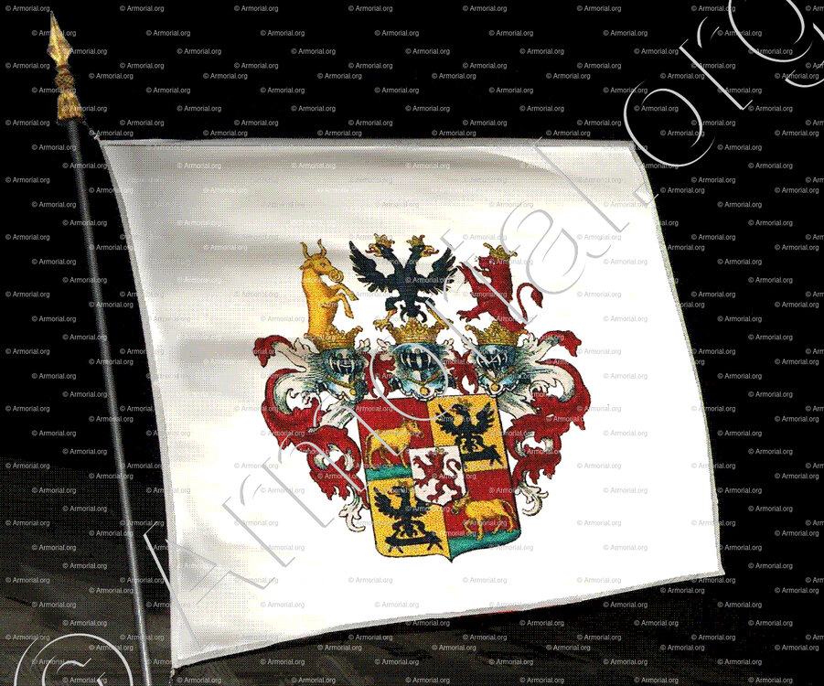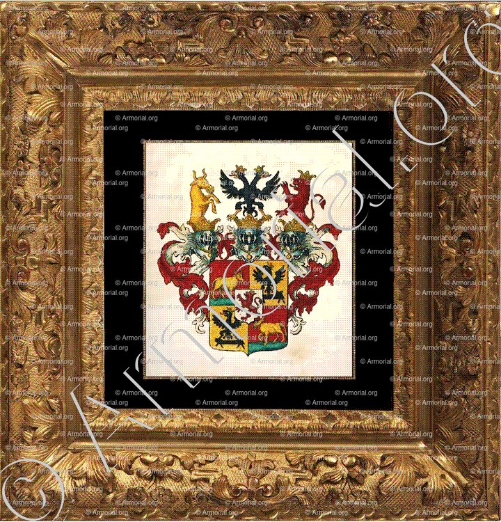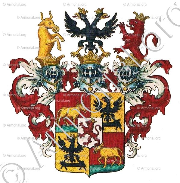- Lambrequin: d'or et de gueules; 2° une aigle éployée de sable, becquée, membrée et couronnée d'or.