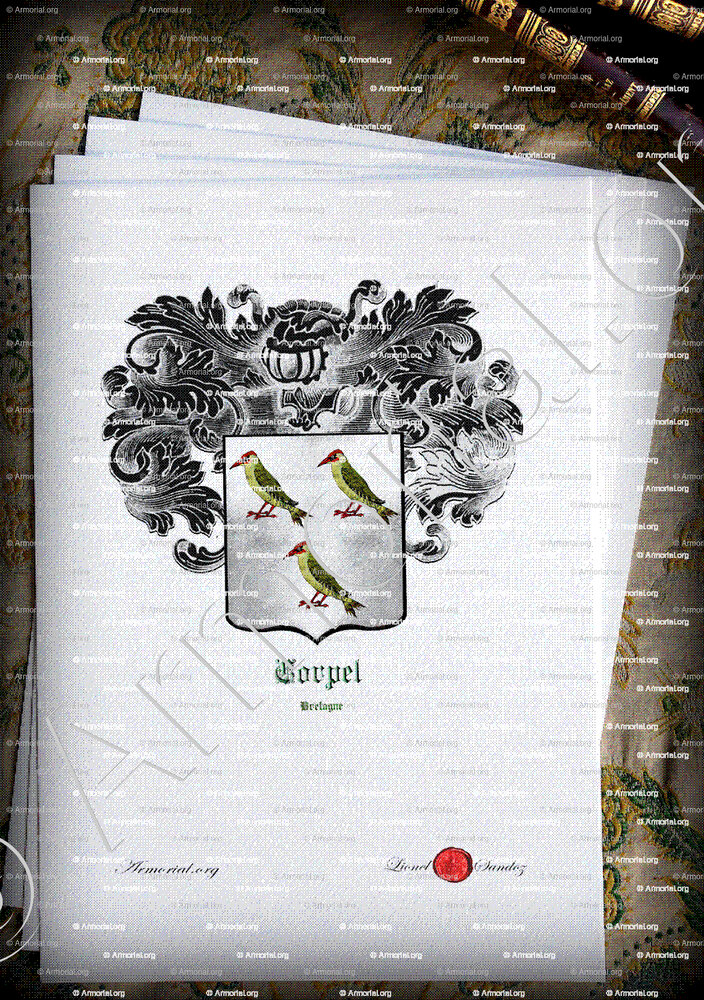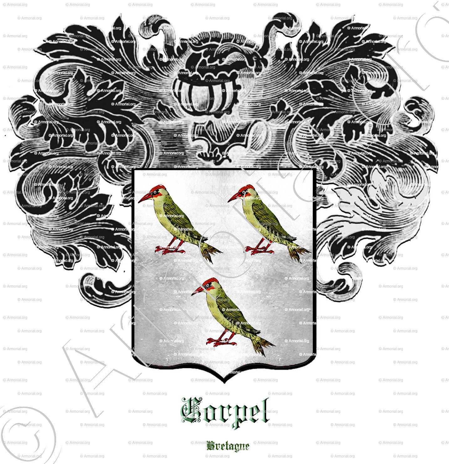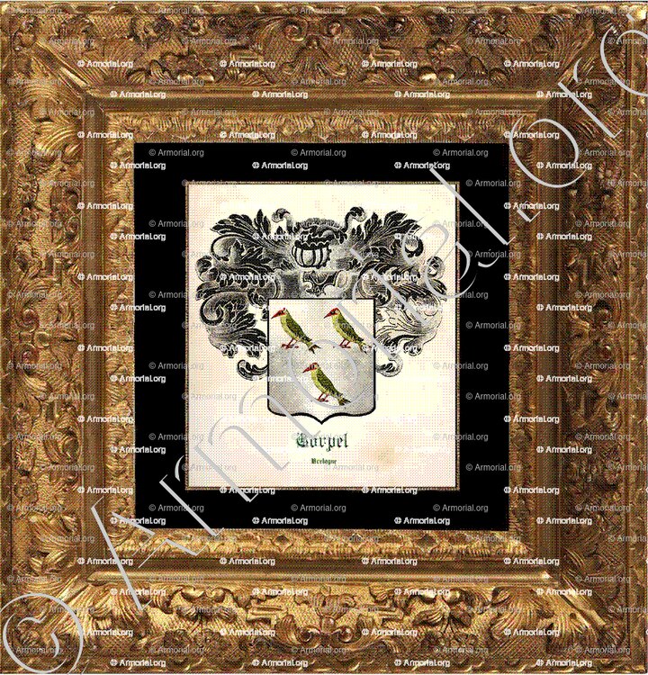 Corpel is the name of an old family of Léon, in Brélez and Plouzané, which bore "silver with 3 green woodpeckers, beaked and membered gules. "(Courcy, volume I, p.292