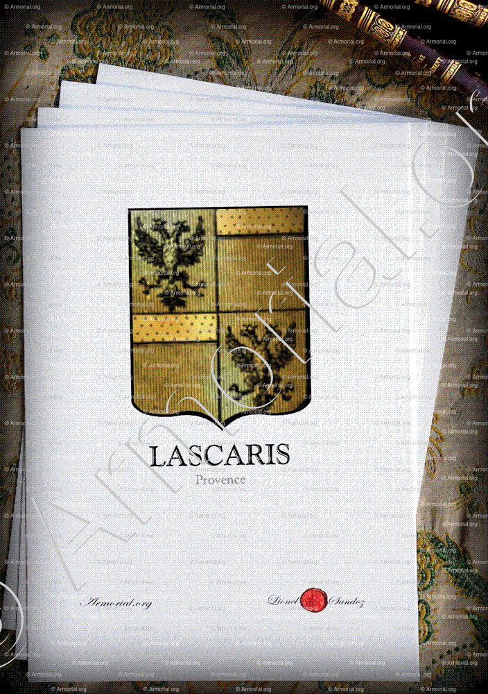 Famille LASCARIS - Blason LASCARIS - Blasonnement LASCARIS - Armoiries LASCARIS - Armoiries de famille LASCARIS - Armorial LASCARIS - Armes LASCARIS - Armes sur un écu LASCARIS - Ecu LASCARIS - Ecus armoriés LASCARIS - Bannière, flanchières, caparaçon armoriés LASCARIS - Bouclier armorié LASCARIS - Sceau LASCARIS - Sceau armorié LASCARIS - Archives LASCARIS - Généalogie LASCARIS - Arbre généalogique LASCARIS - Ascendance LASCARIS - Descendance LASCARIS - Héraldique LASCARIS - Origine LASCARIS - Les LASCARIS dans l'Histoire - Les LASCARIS dans la noblesse - Devise LASCARIS - Armoiries de bourgeoisie LASCARIS - Armoiries de noblesse LASCARIS.