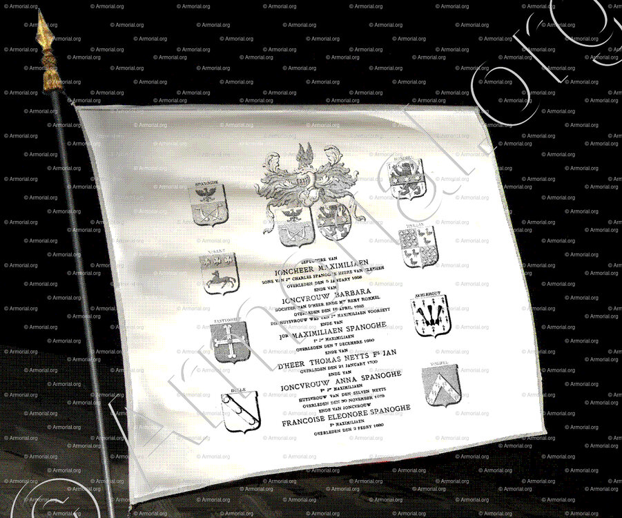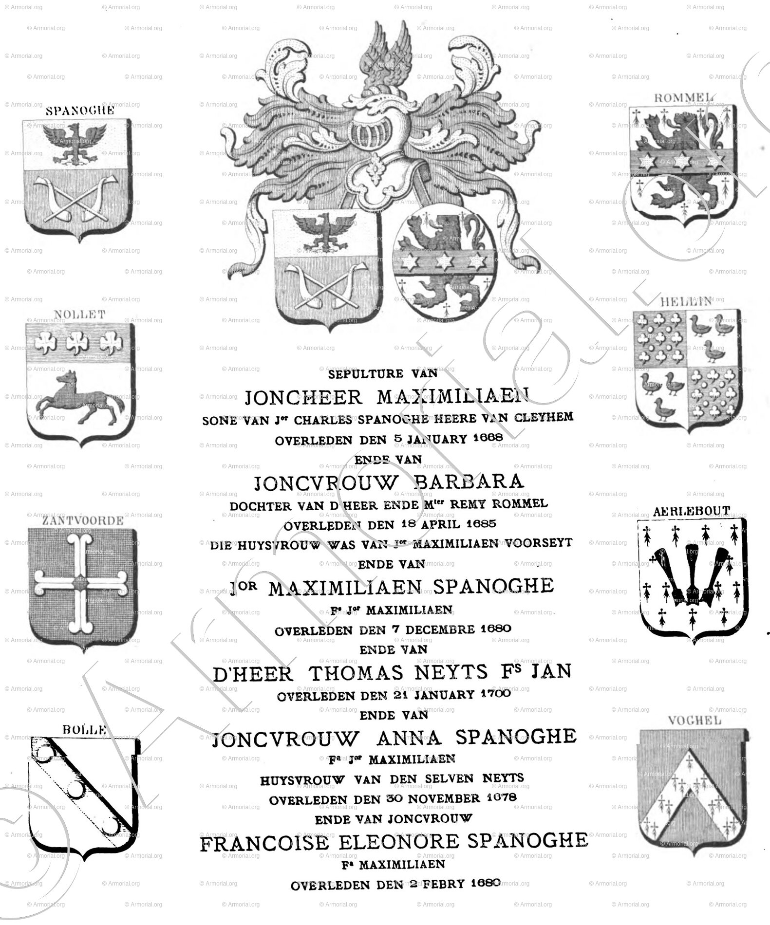 Wapenschild met de acht kwartieren van Maximilien SPANOGHE, zoon van Maximilien en Barbe ROMMEL (grafsteen in de Onze-Lieve-Vrouwkerk in Brugge) waar we het wapen van NOLLET terugvinden. Hij was de zoon van Charles SPANOGHE, raadslid, hoofdman en schepen van Brugge, en Marguerite NOLLET.