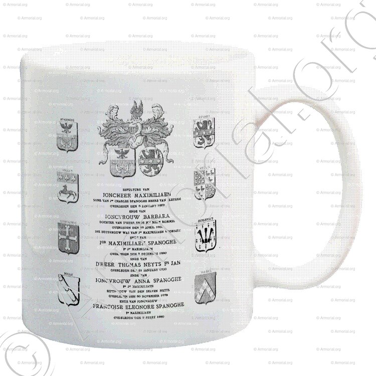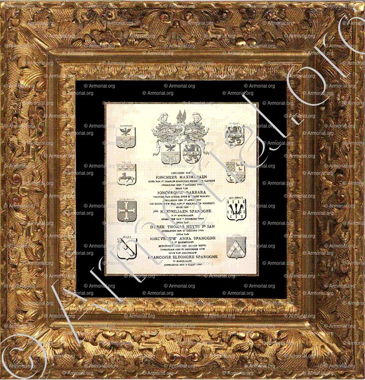Blason aux huit quartiers de Maximilien SPANOGHE, fils de Maximilien et de Barbe ROMMEL (Pierre tombale dans l'Eglise Notre Dame de Bruges) ou l'on retrouve le blason NOLLET.